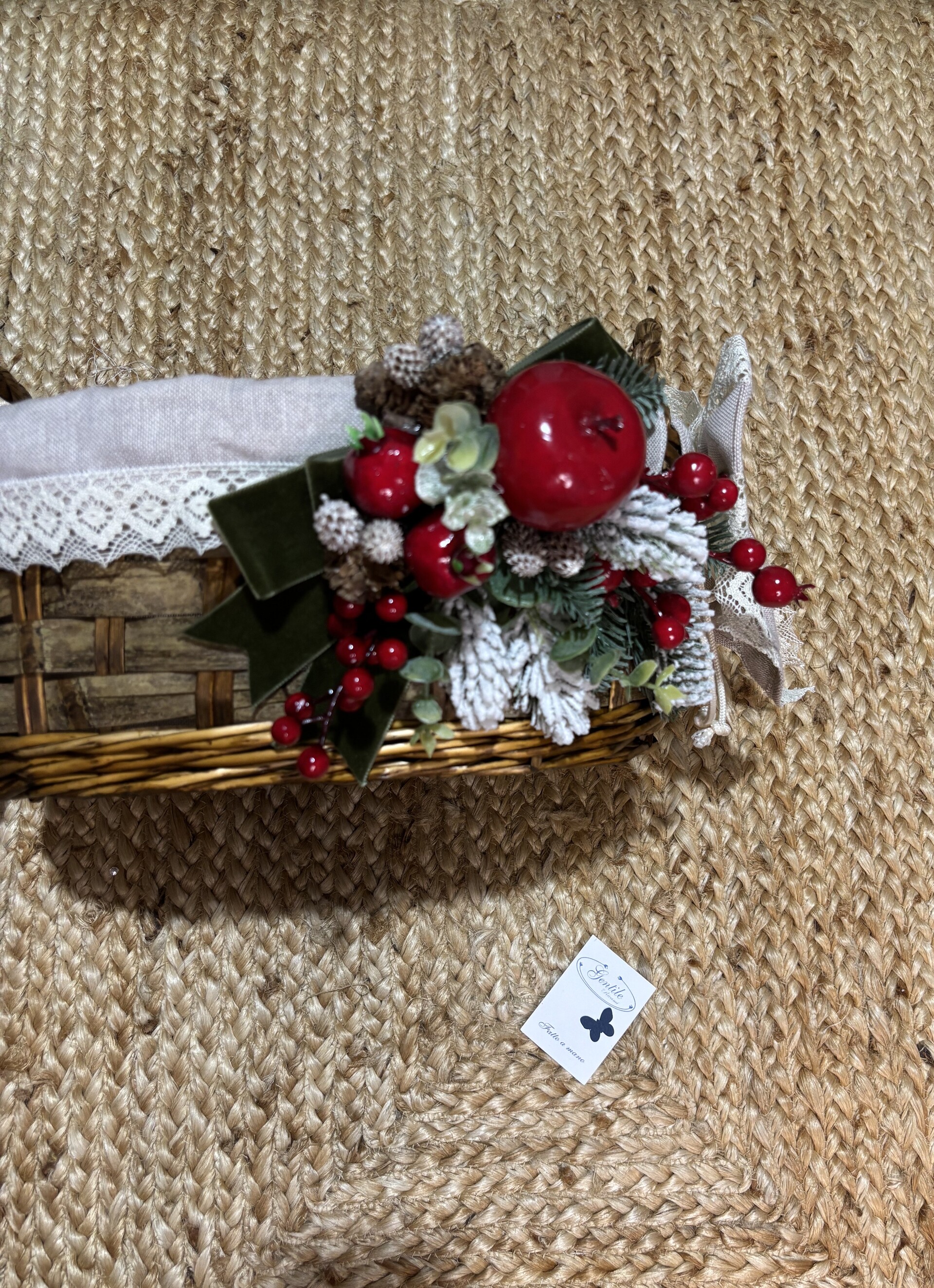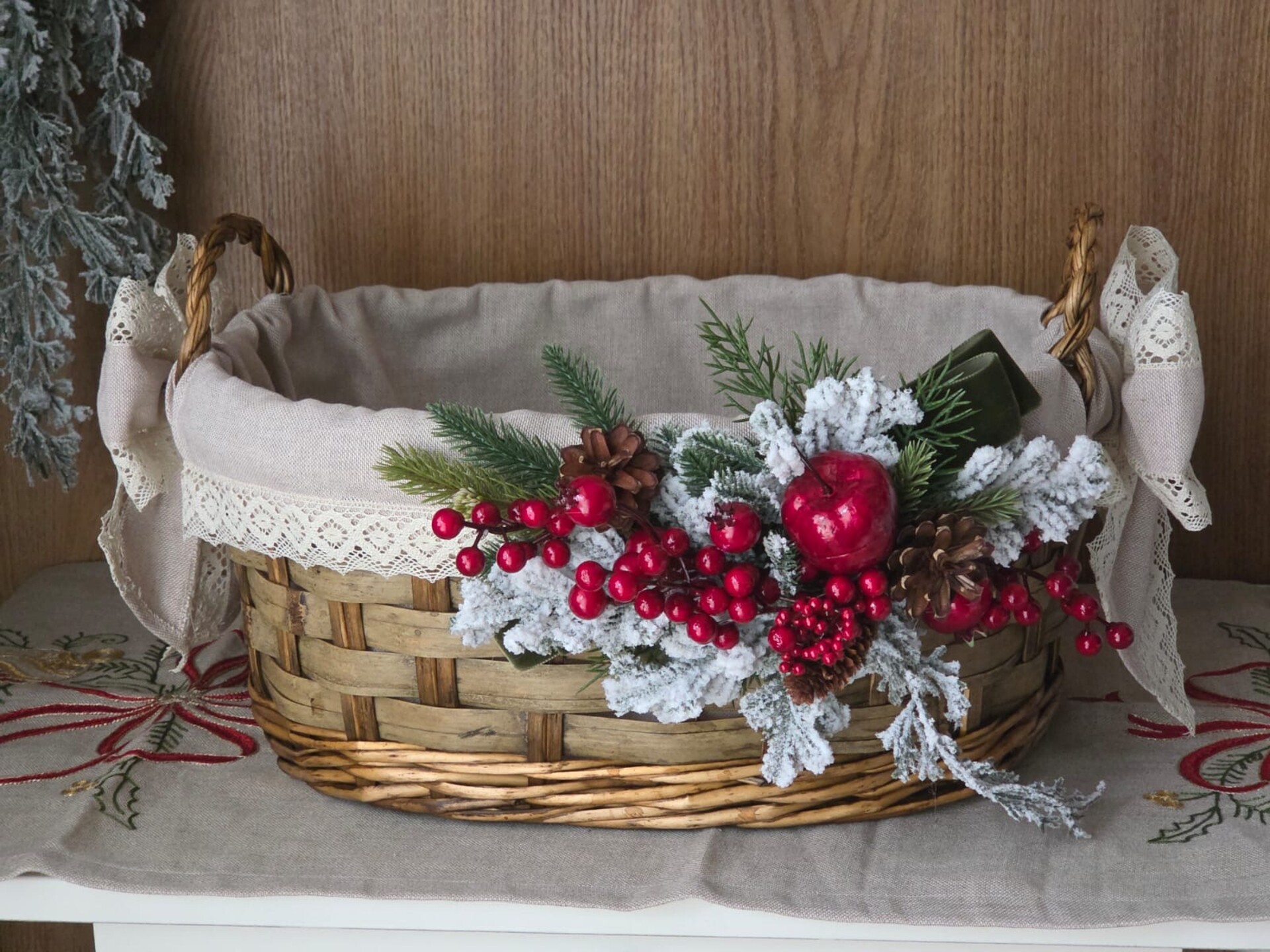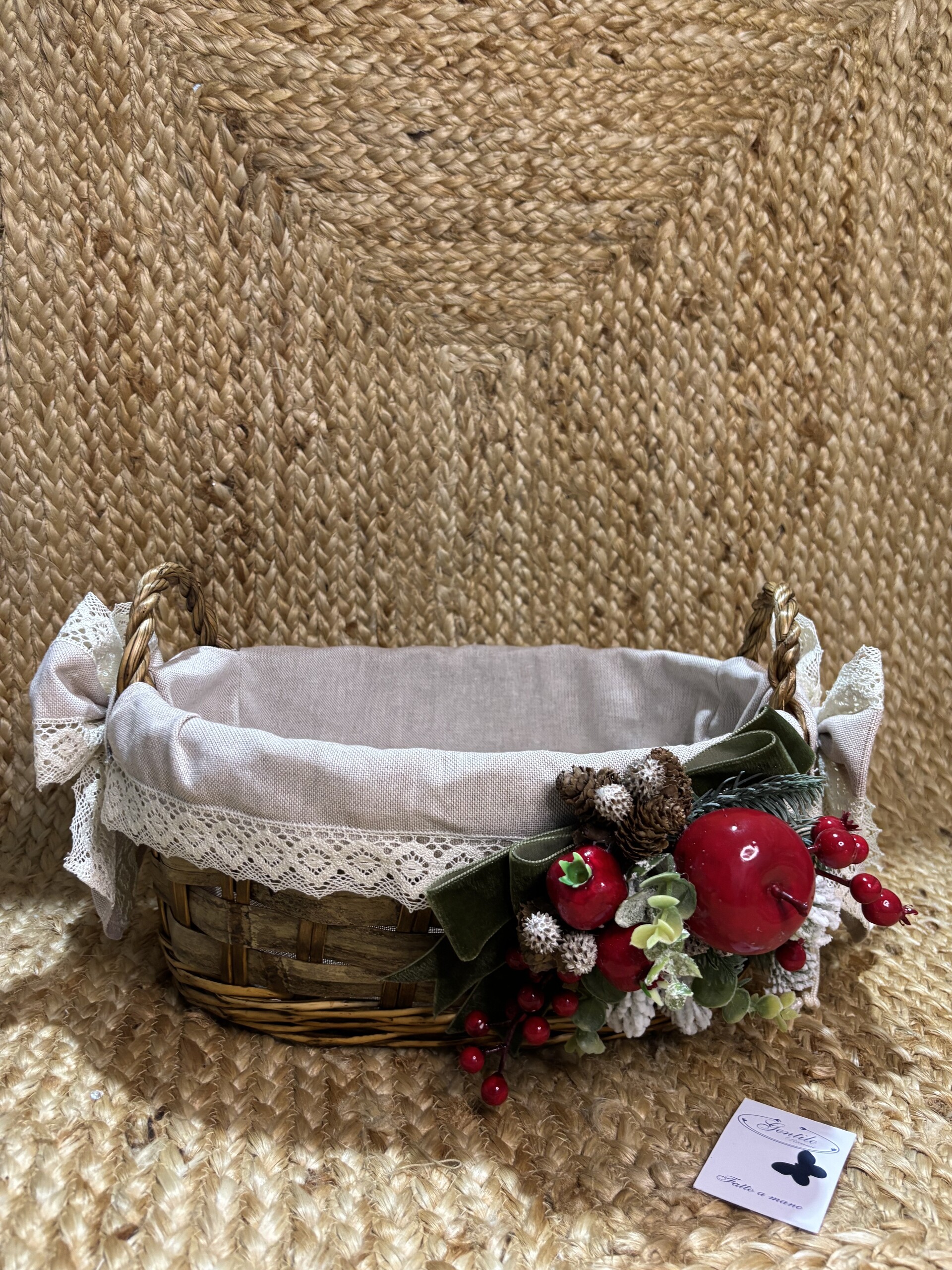 Un intreccio di tradizione e dolcezza prende forma in questo elegante cesto natalizio in vimini rivestito in tessuto e impreziosito da merletto in cotone.