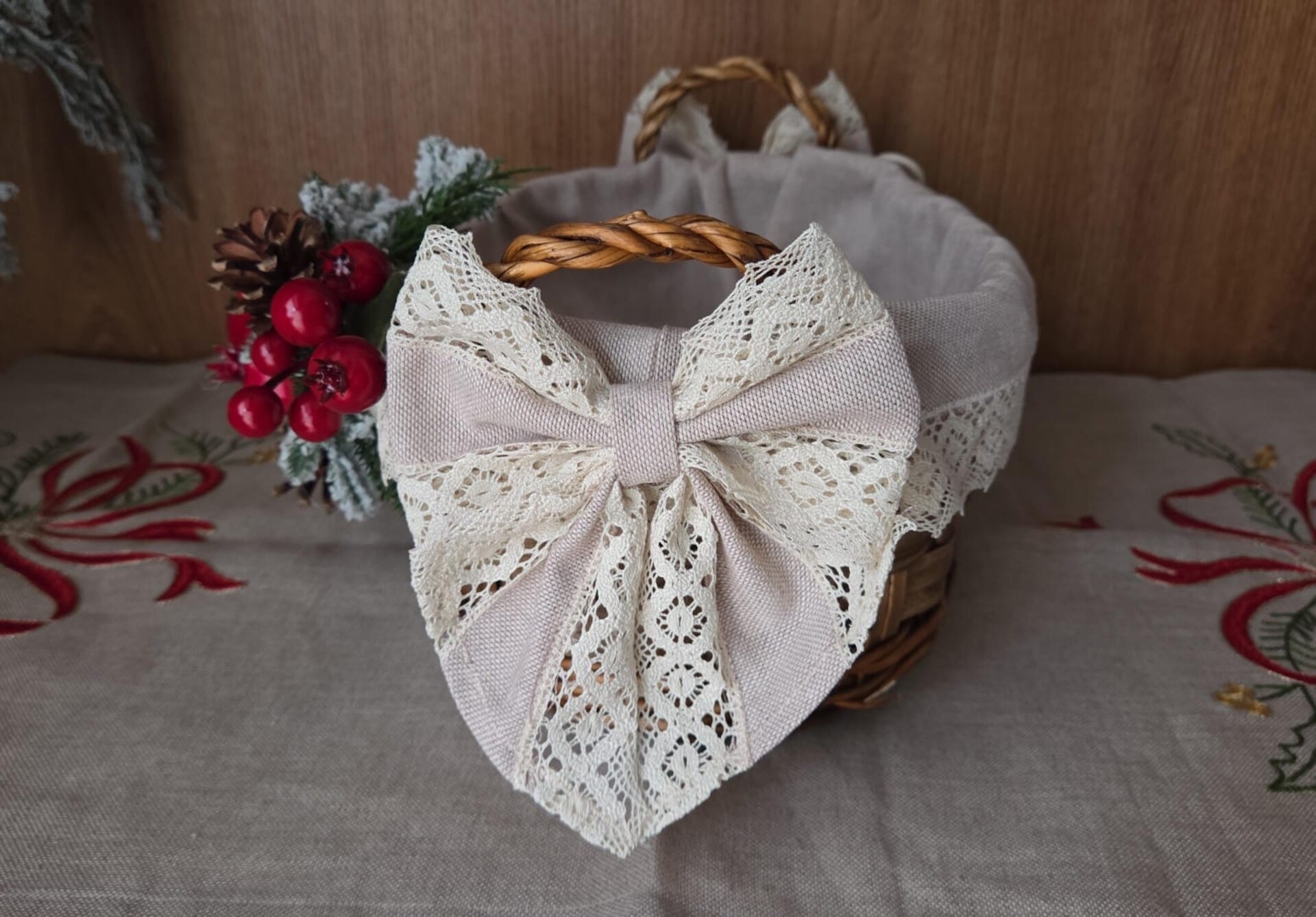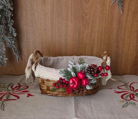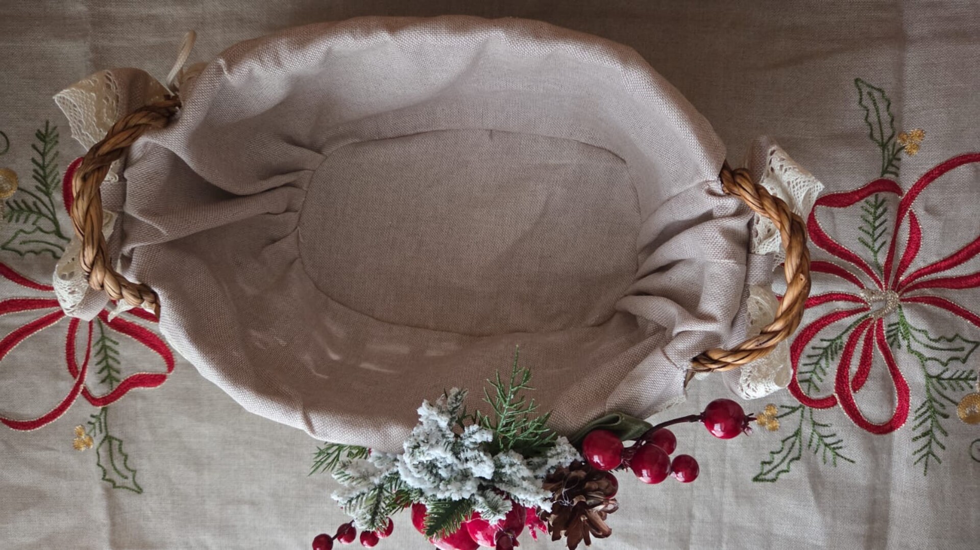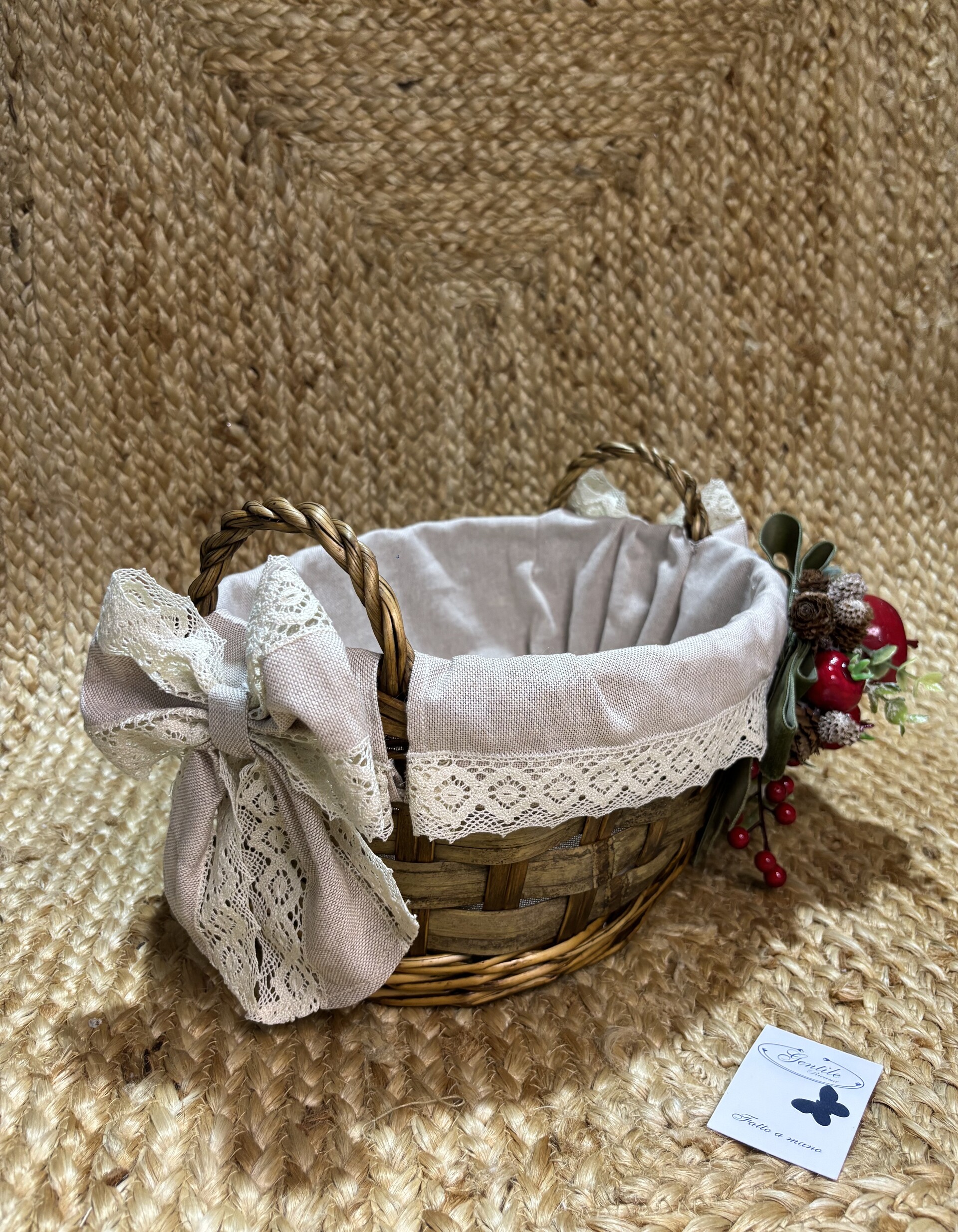Un intreccio di tradizione e dolcezza prende forma in questo elegante cesto natalizio in vimini rivestito in tessuto e impreziosito da merletto in cotone.