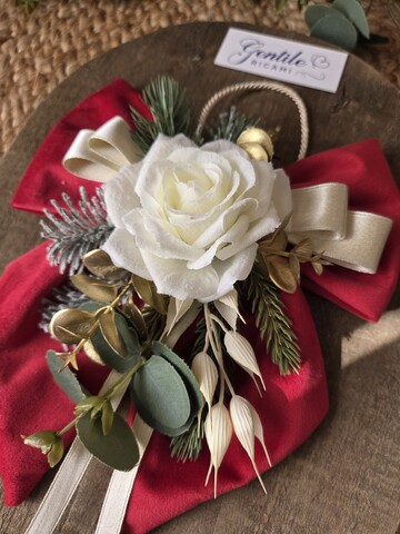 Elegante e profumato fiocco decorativo in velluto rosso con rosa ghiacciata panna, prodotto da Gentile Ricami.