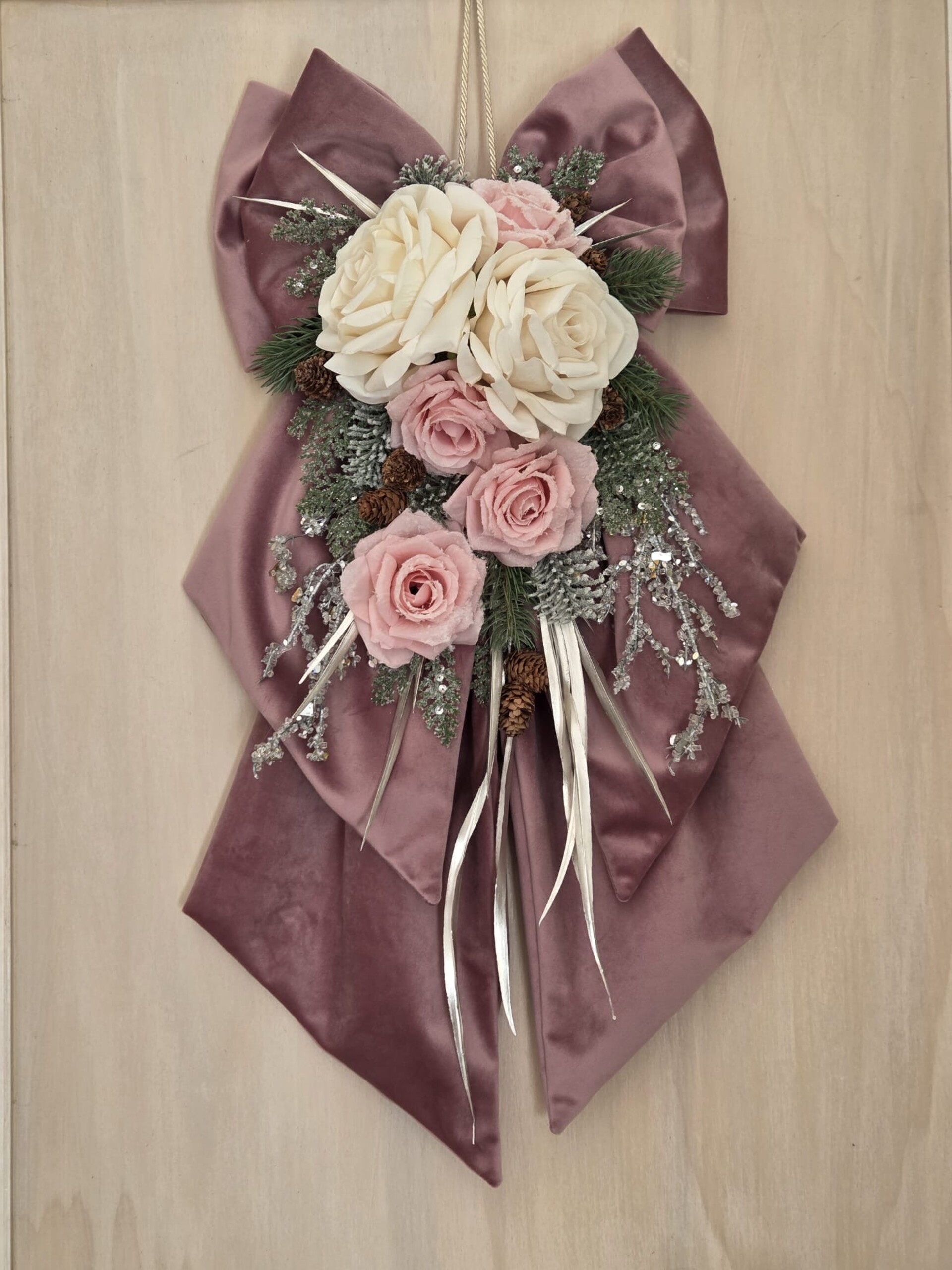 Fiocco natalizio in velluto color rosa cipolla con rose ghiacciate rosa e panna.