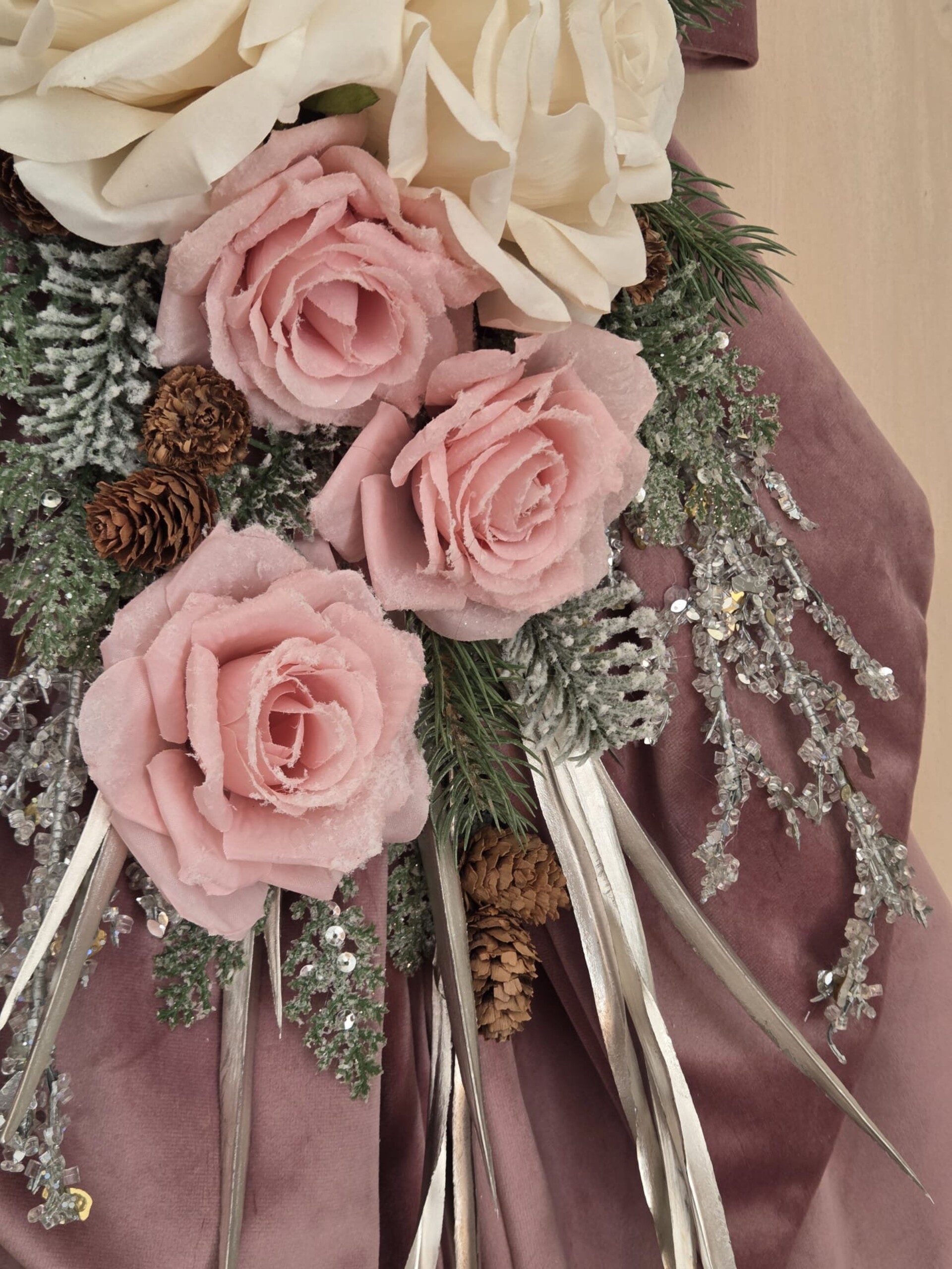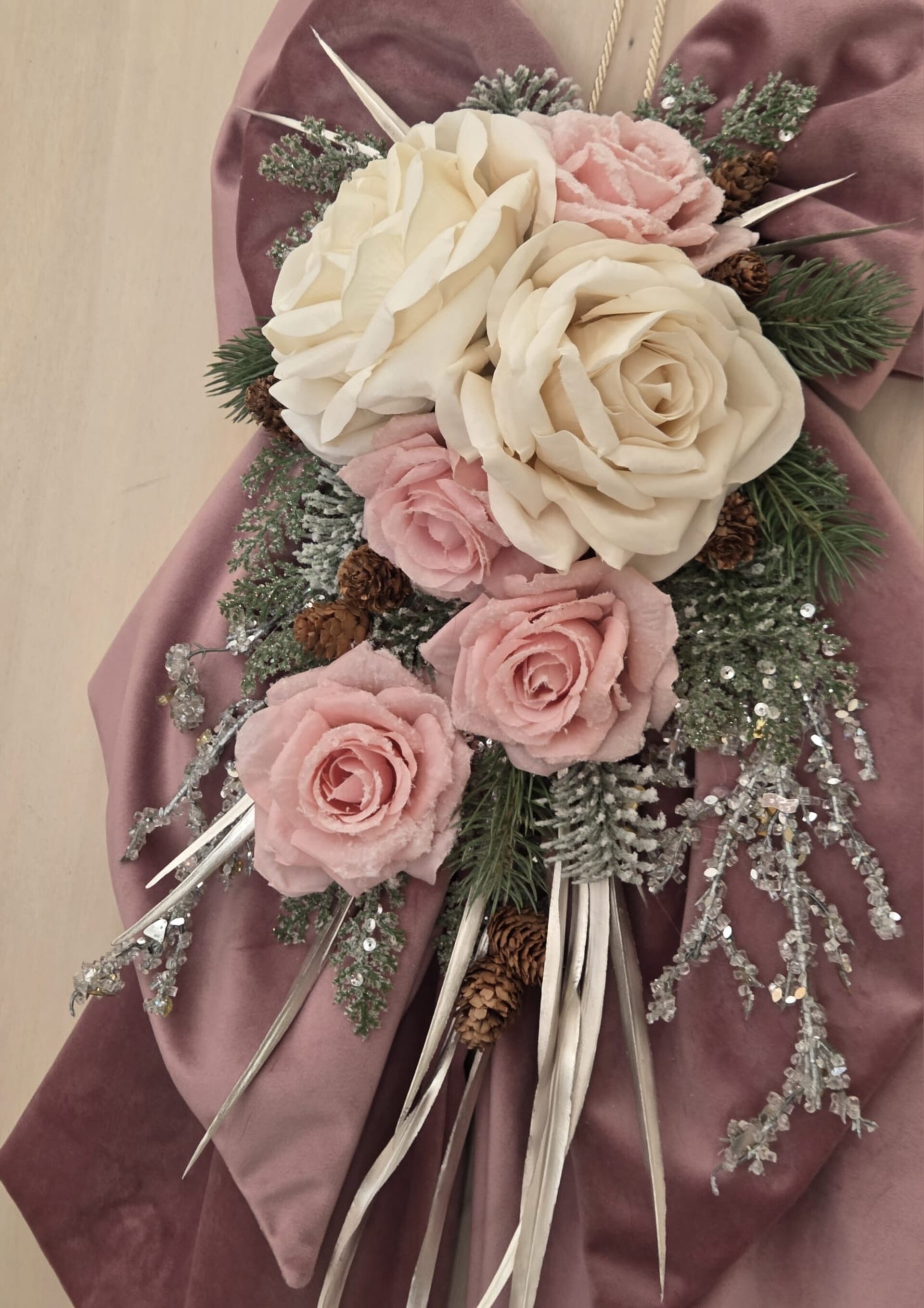 Fiocco natalizio in velluto color rosa cipria scuro con rose ghiacciate.