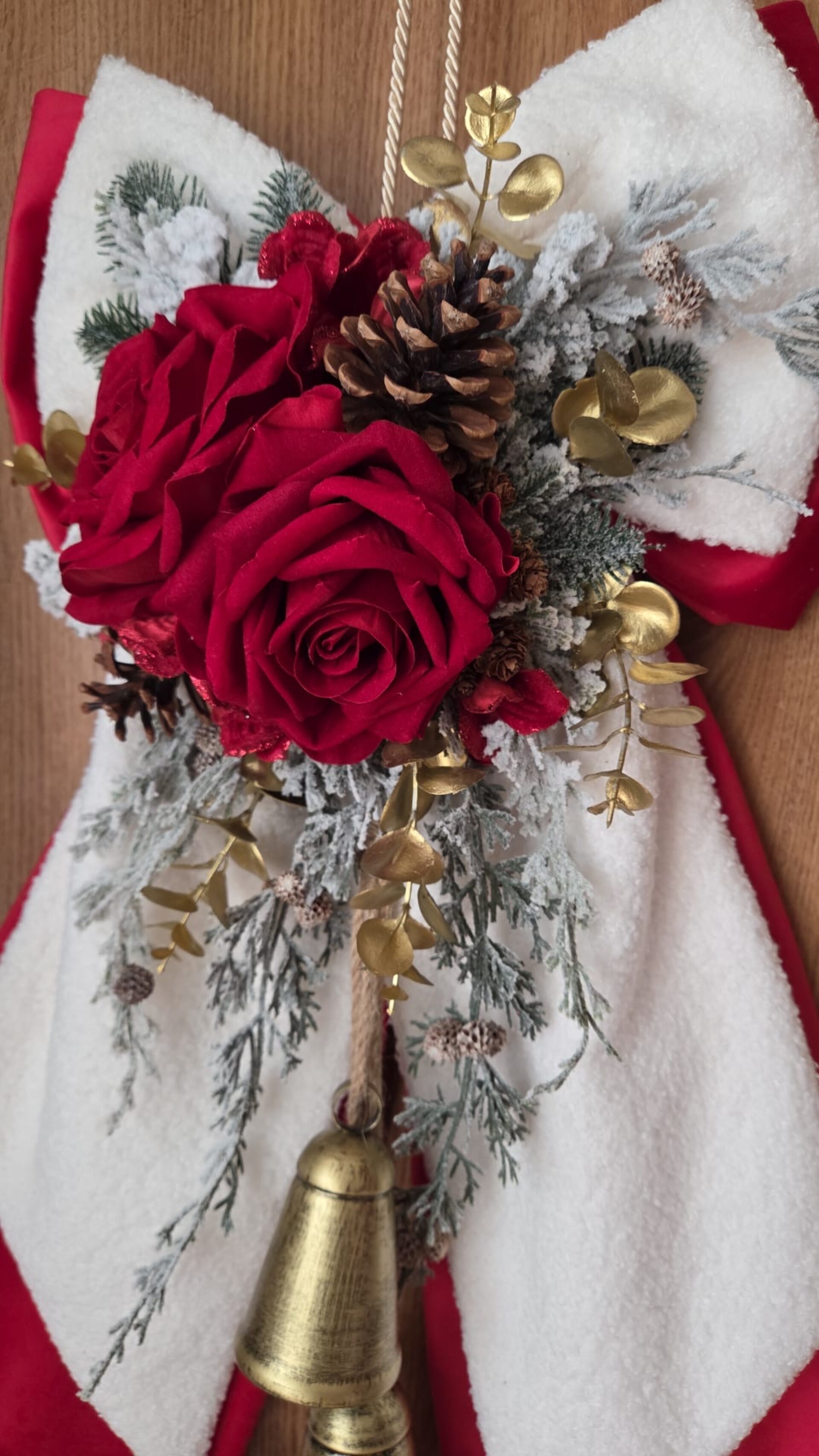Il velluto rosso dona un aspetto raffinato e luminoso, la lana bouclè aggiunge morbidezza e un mood invernale, i fiori artificiali impreziosiscono il fiocco con dettagli realistici e armoniosi, mentre i campanacci portano un tintinnio e un fascino tipicamente montano, perfetto per l'atmosfera natalizia.