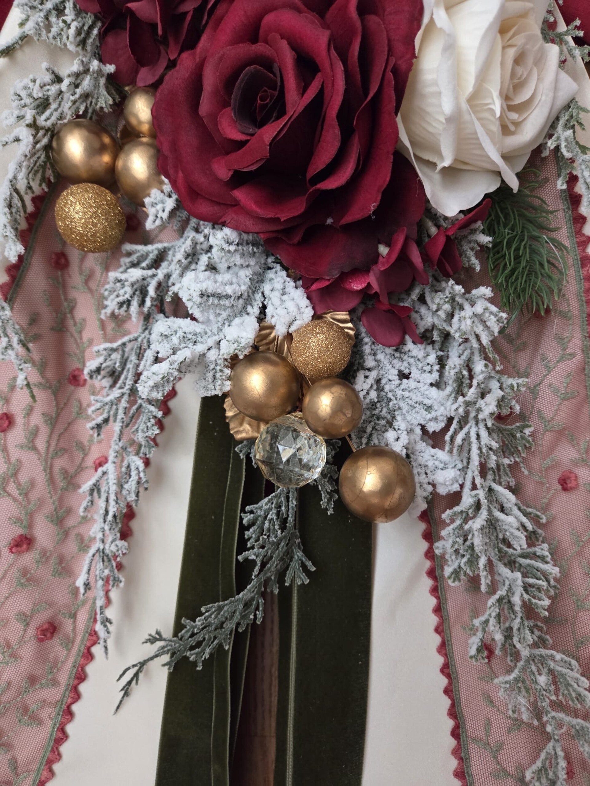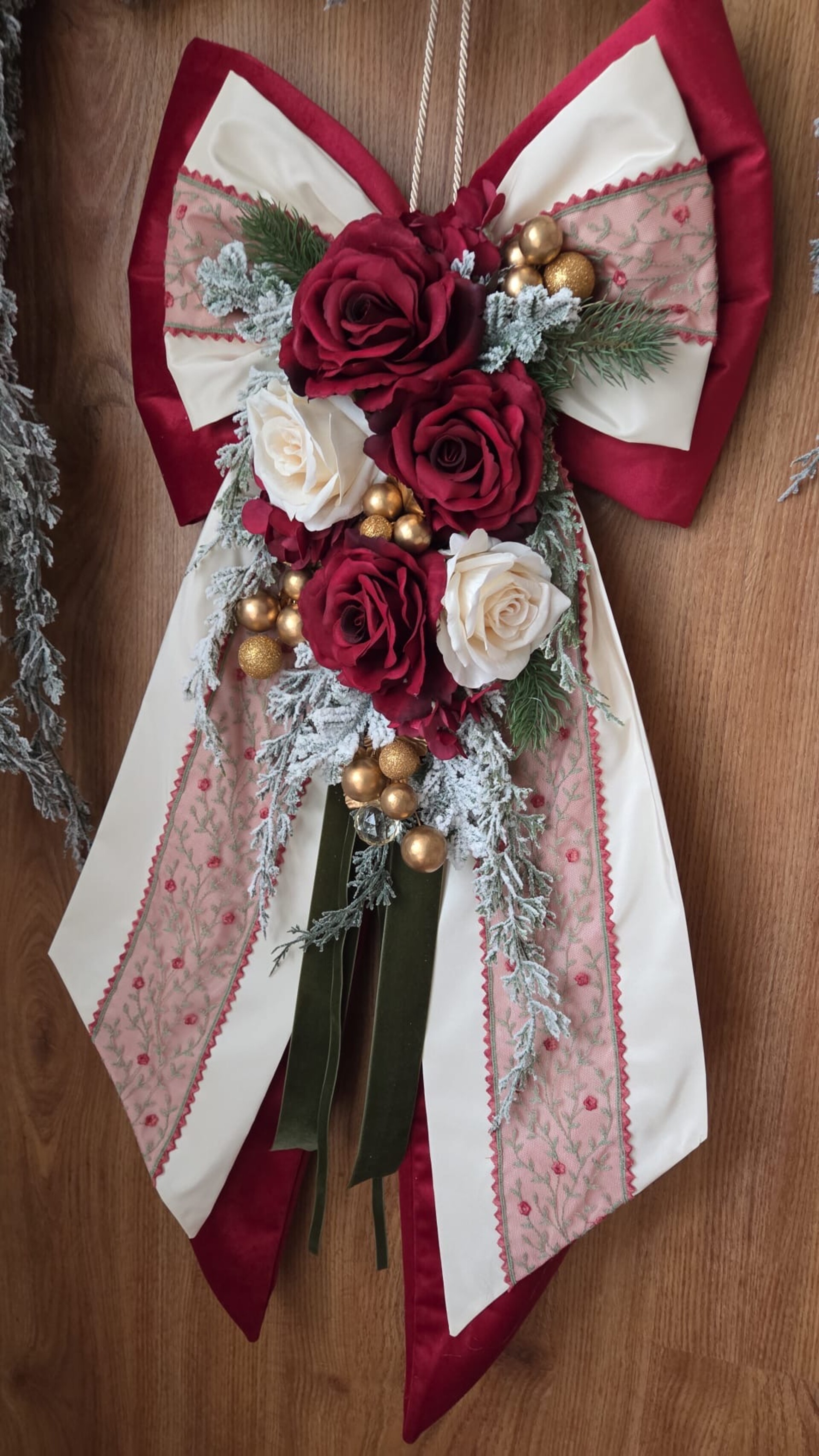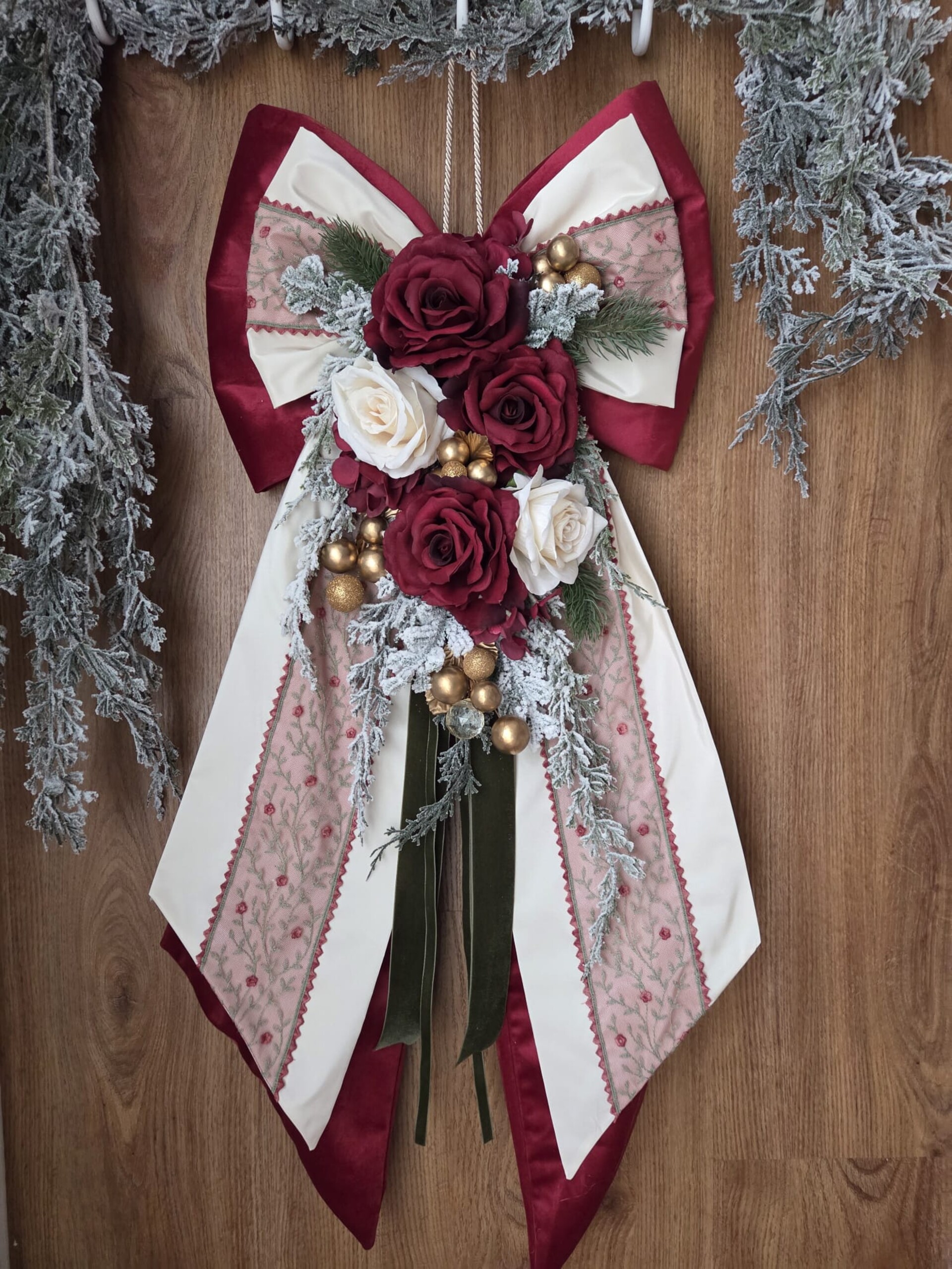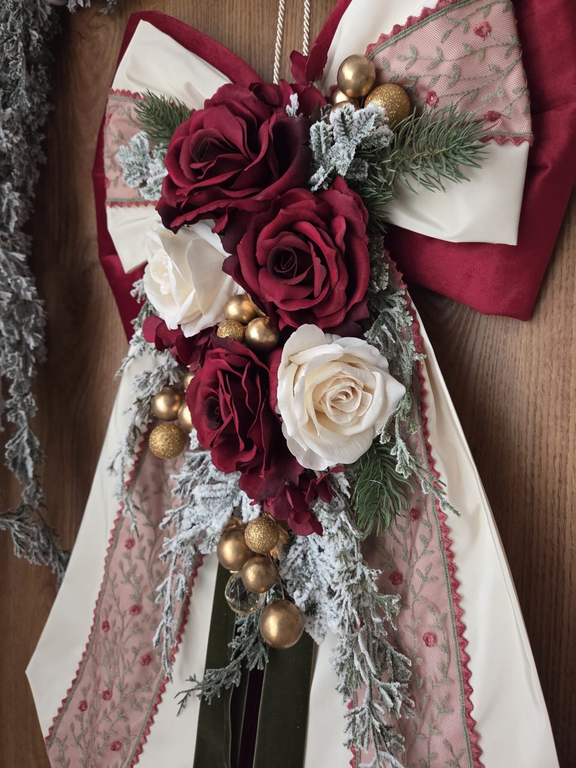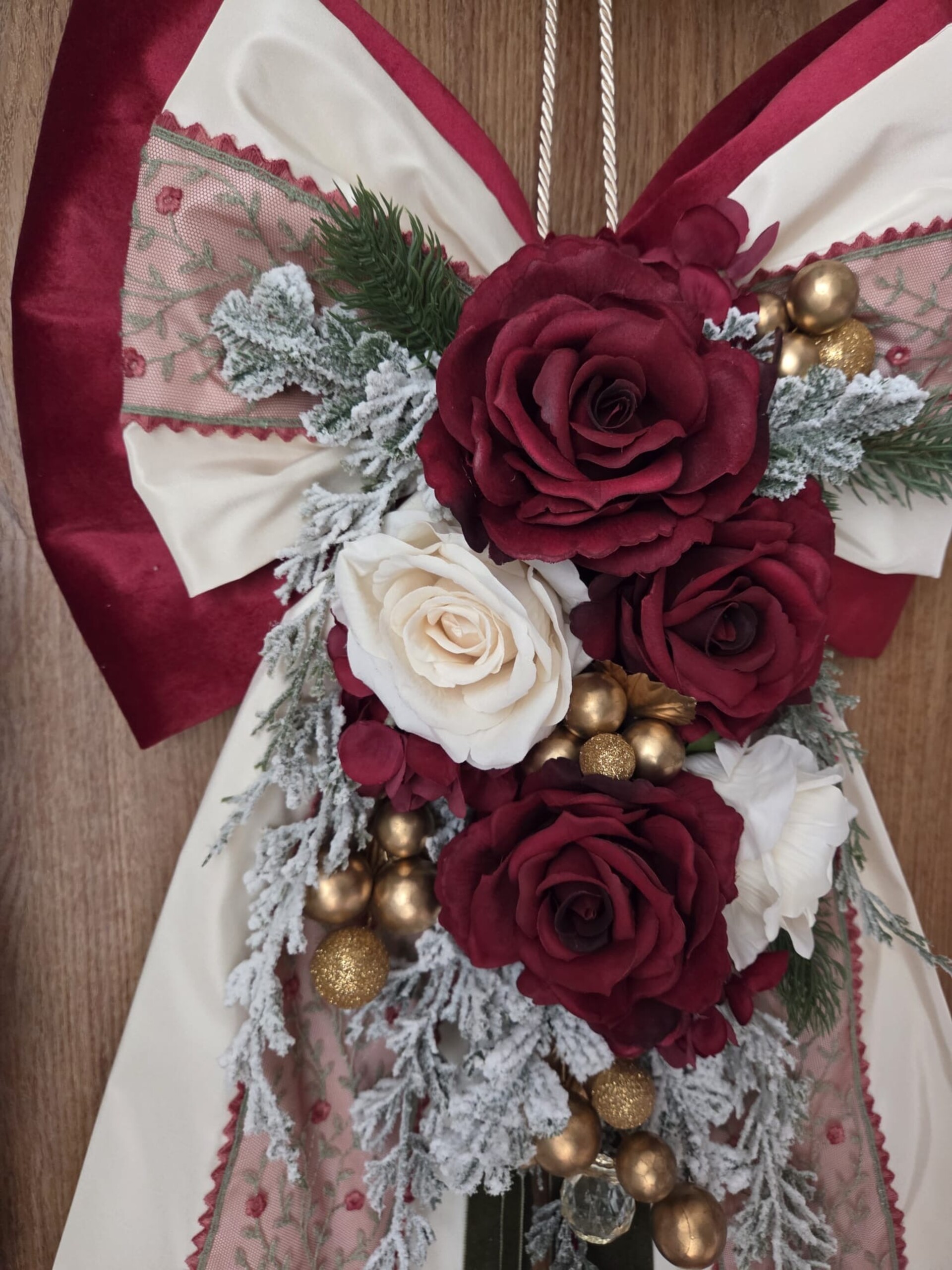 Maxi fiocco fuori porta in velluto bordeaux, taffetà, pizzo in tulle di cotone e fiori artificiali