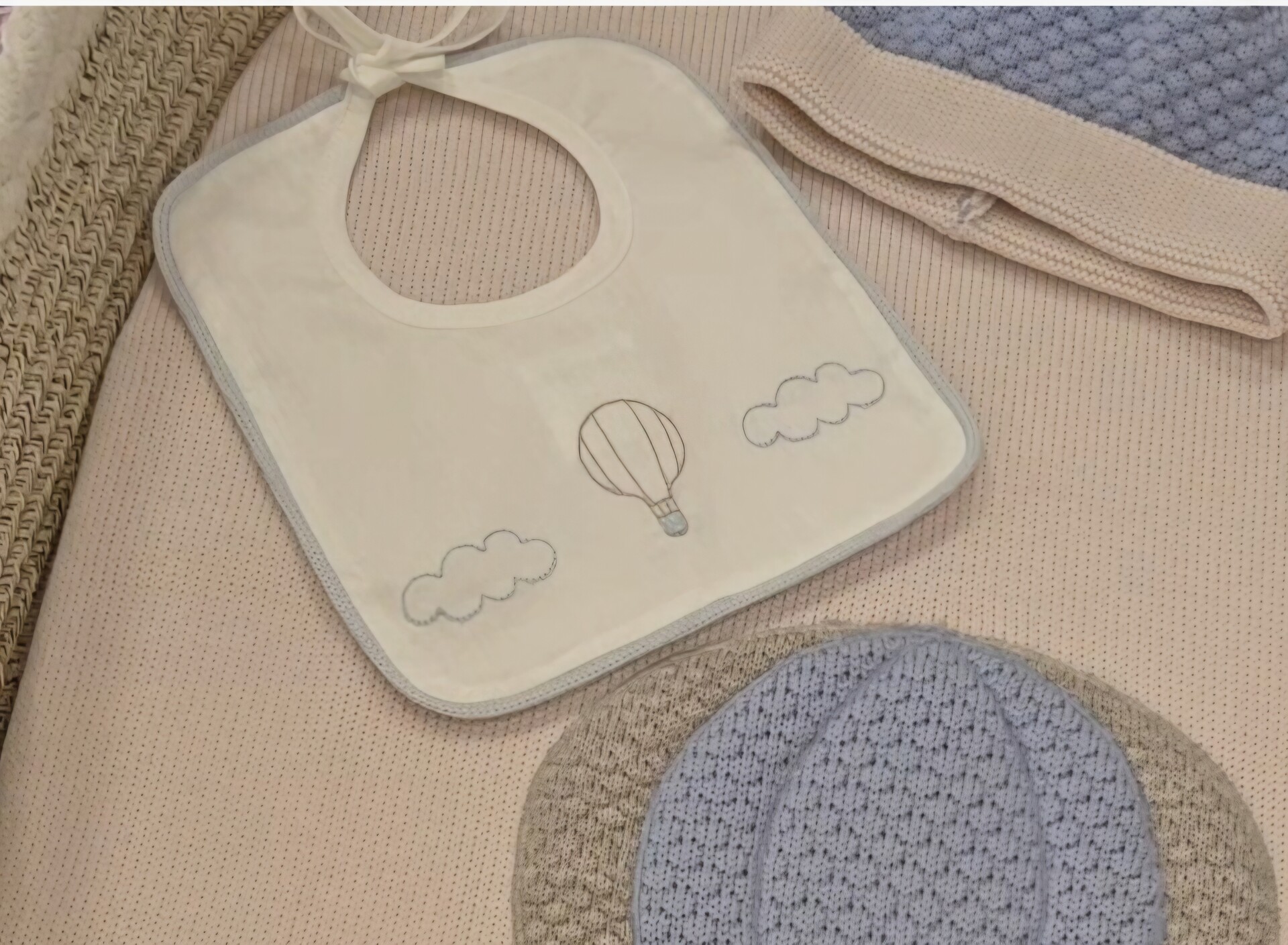 Bavetta in puro cotone con mongolfiera e nuvolette.
