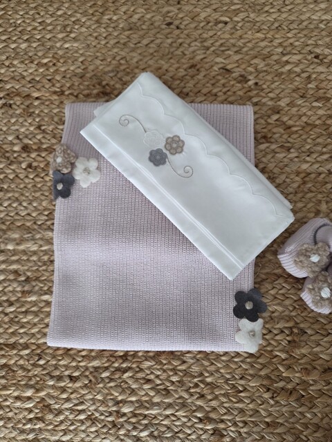 Copertina in pura lana con fiori applicati e lenzuolino 3 pezzi in morbida mussola di cotone con fiorellini ricamati nel risvolto.