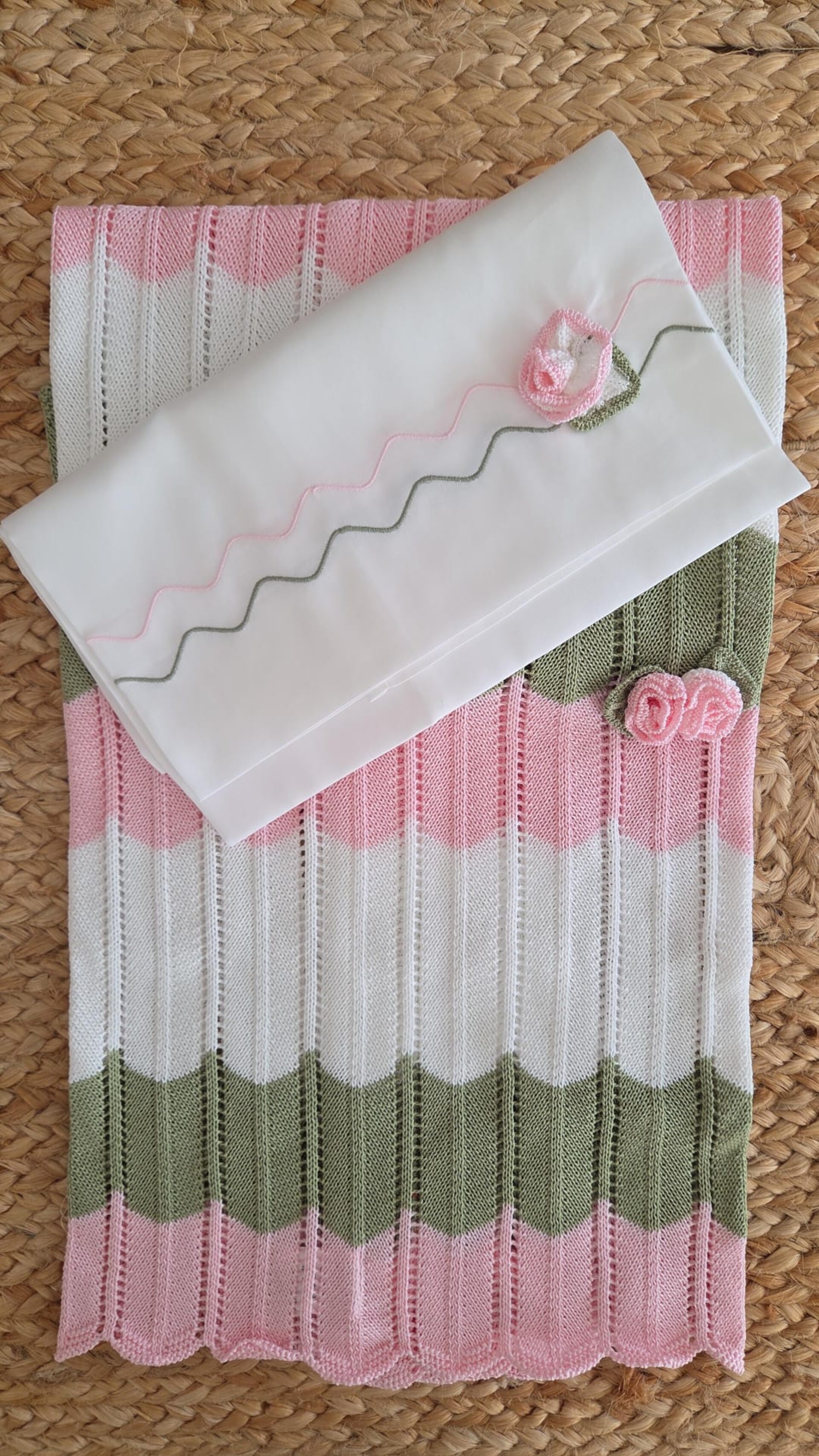Copertina per carrozzina in filo di puro cotone impreziosita da fiorellini in rilievo.