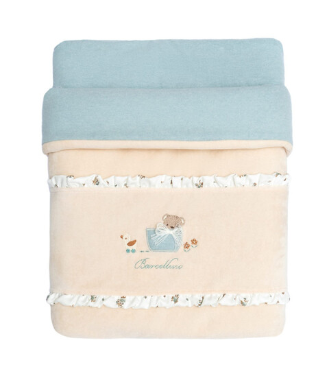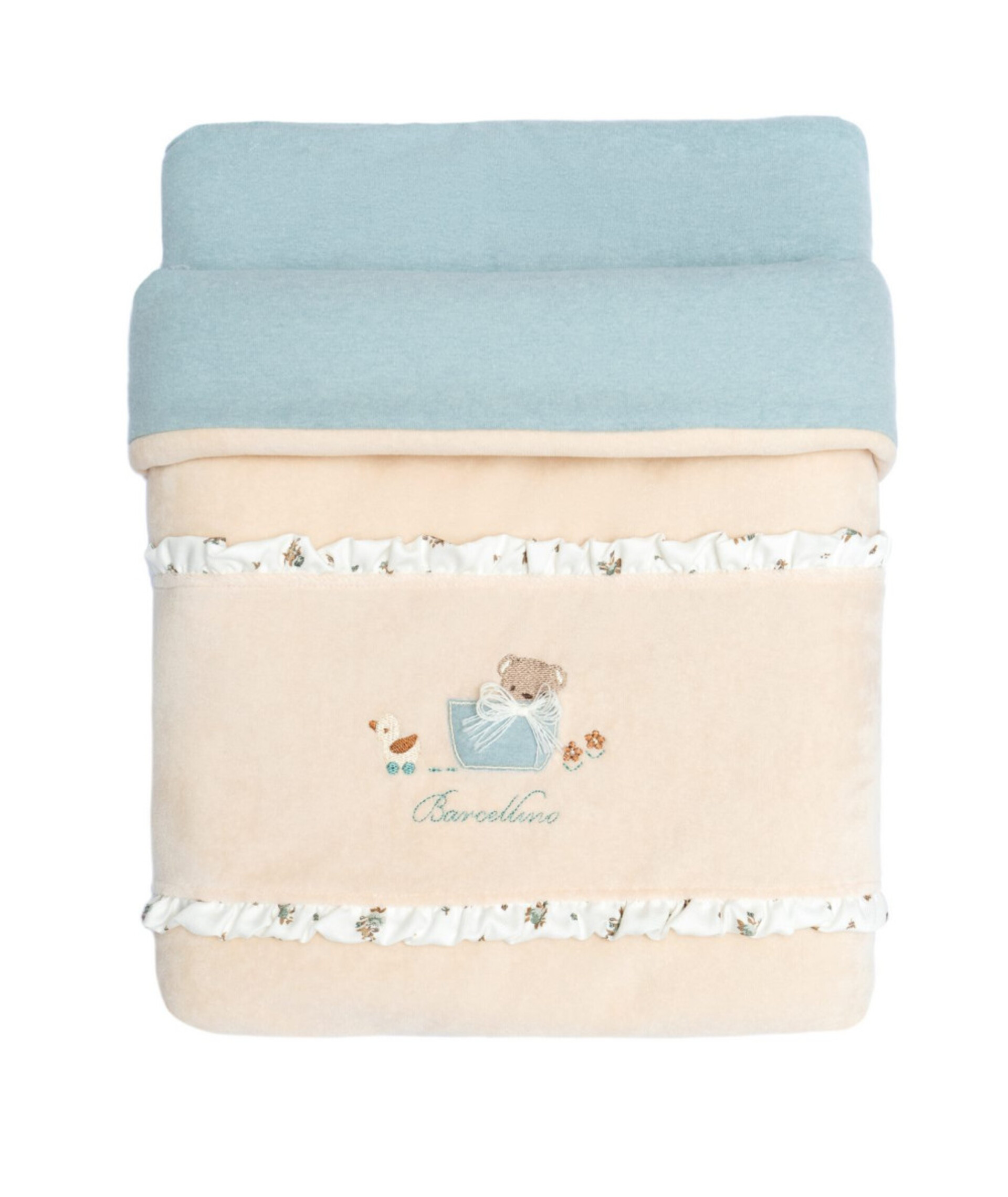 Copertina imbottita per cazzozzina in ciniglia impreziosita da dettagli ricamati e rouches.
