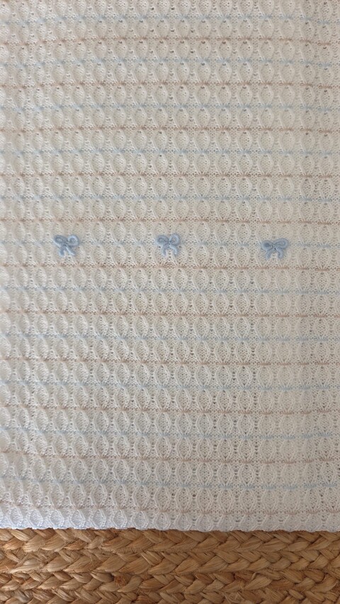 Copertina per carrozzina in filo di puro cotone arricchita da una lavorazione traforata e da piccoli fiocchetti.