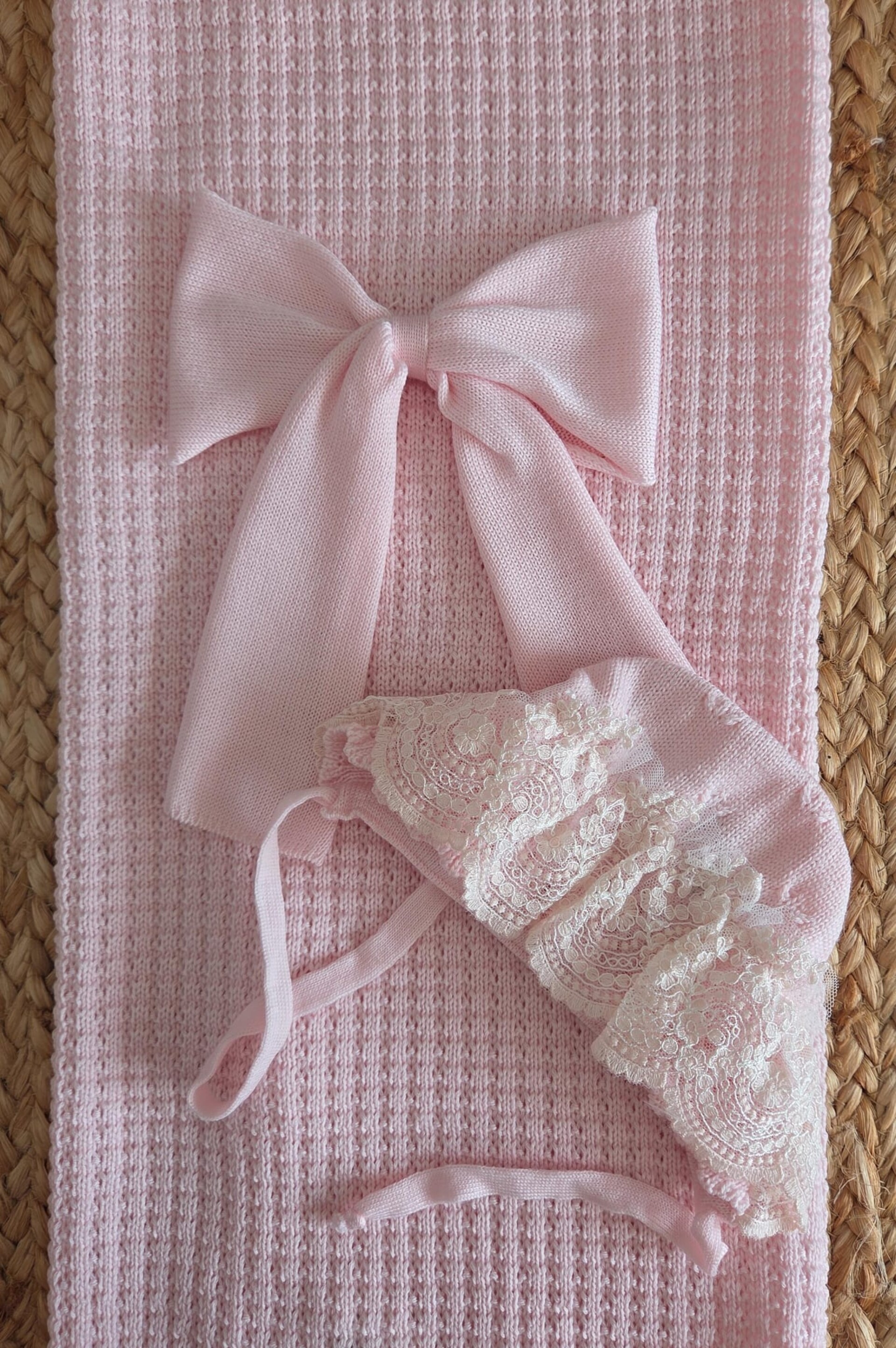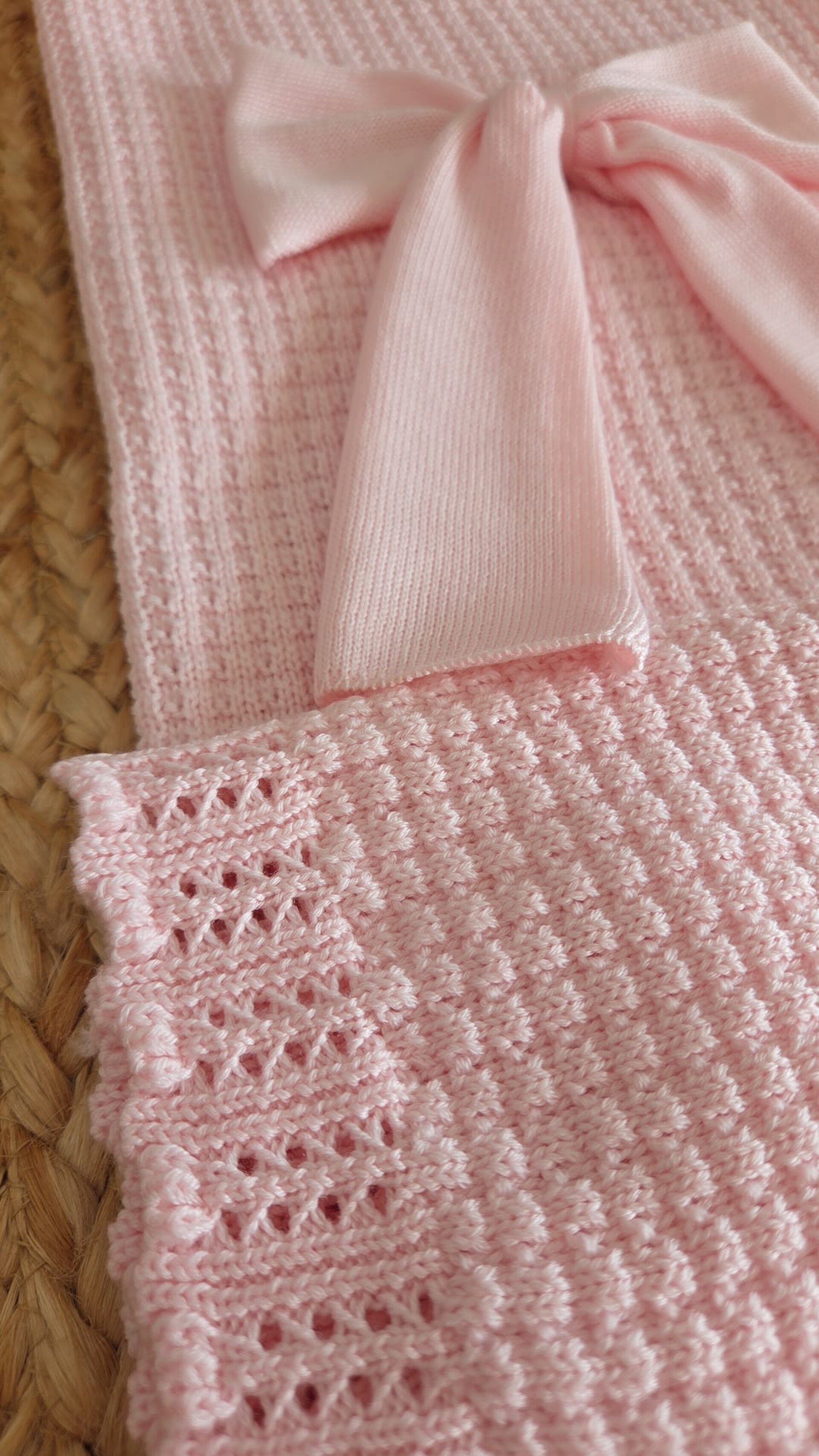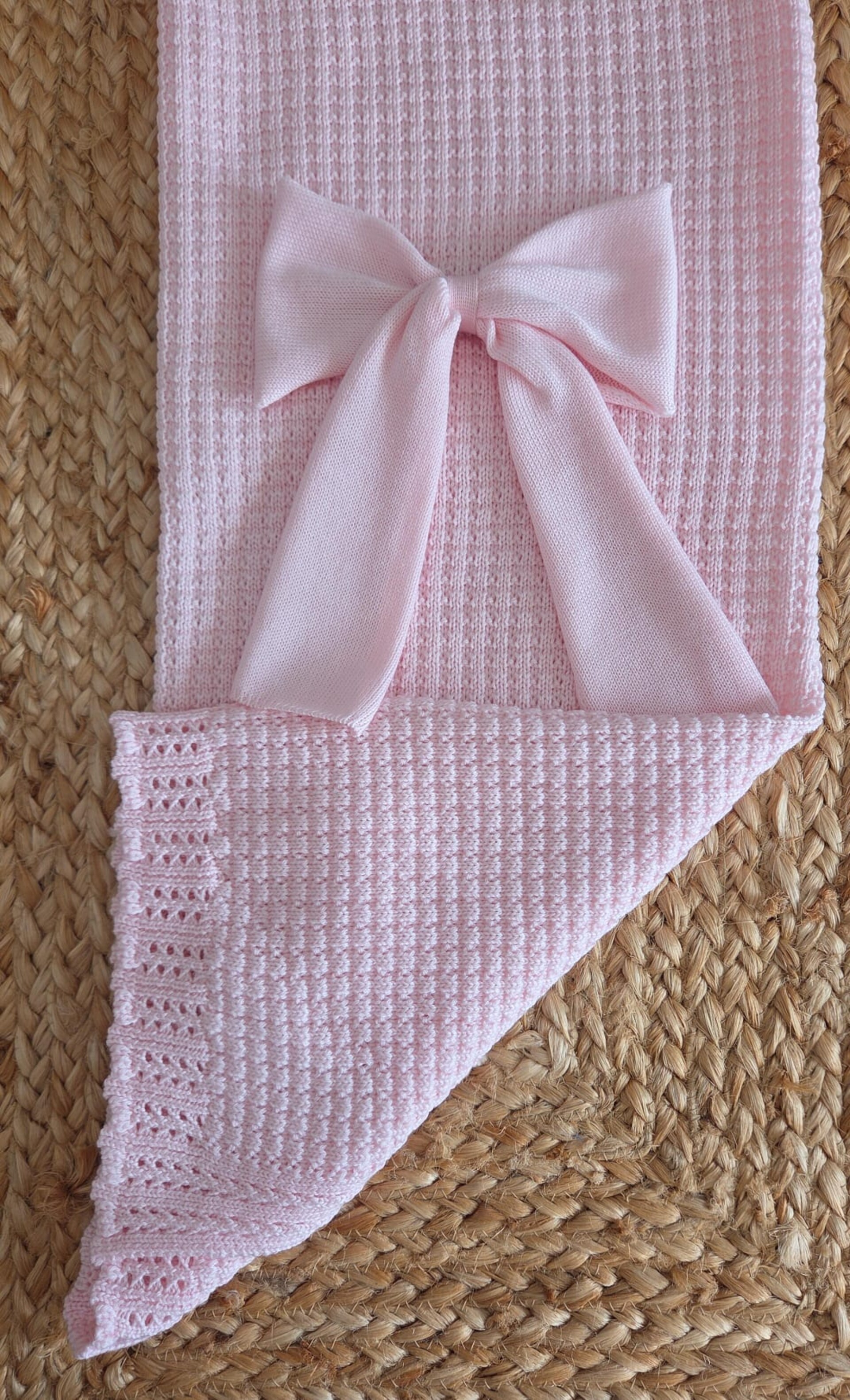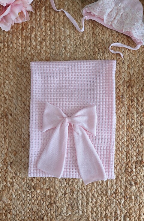 Copertina per carrozzina in pura lana color rosa impreziosita da un fiocco.