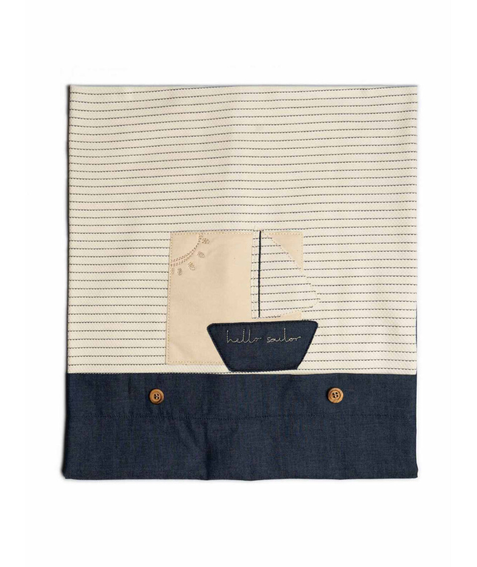 Copertina per carrozzina sfoderabile in cotone con righe panna e blu nella parte superiore, tessuto jeans nella parte inferiore e fodera integrata.