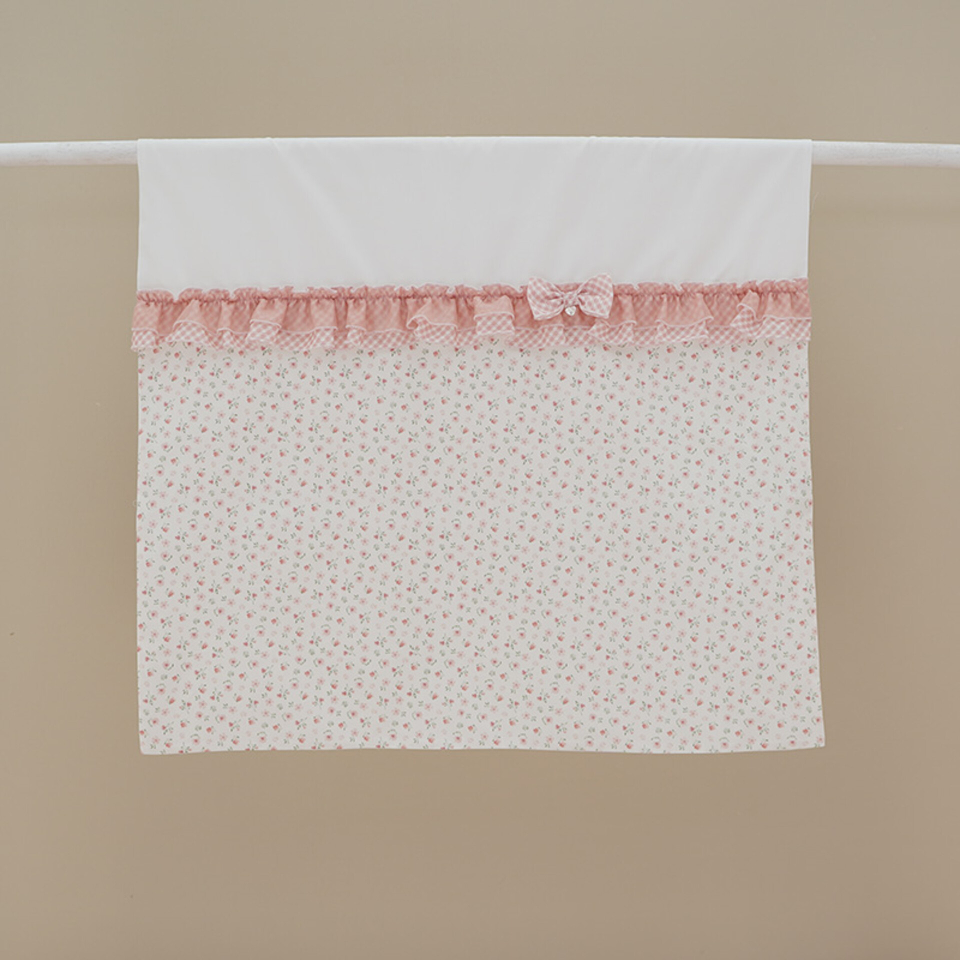 Copertina per carrozzina in puro cotone bianca nella parte superiore, impreziosita da una balza arricciata ed un fiocchetto a quadri bianchi e salmone, mentre la parte inferiore è caratterizzata da una fantasia floreale.