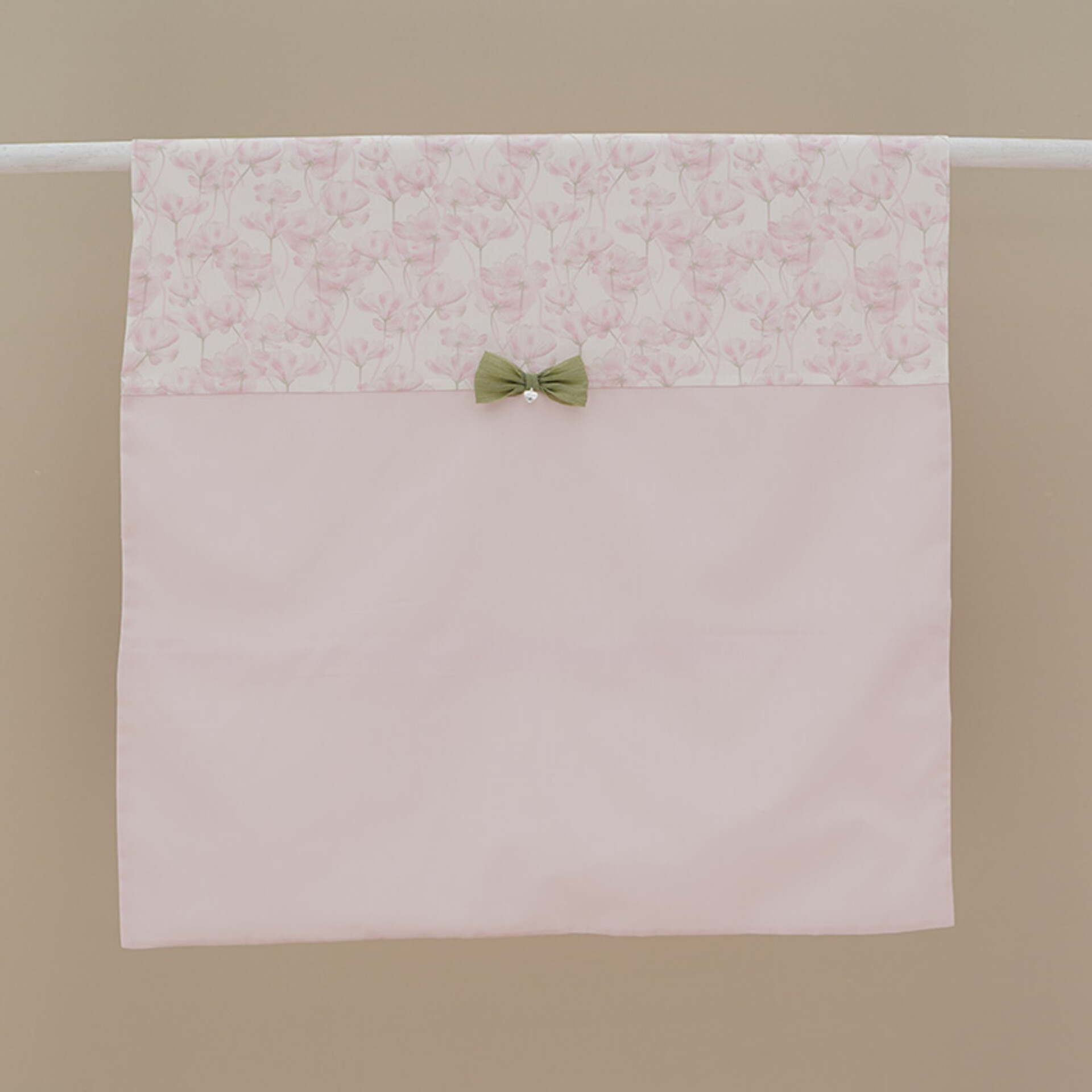Copertina per carrozzina in puro cotone con fantasia floreale nella parte superiore, impreziosita da un fiocchetto verde e tinta unita nella parte inferiore.