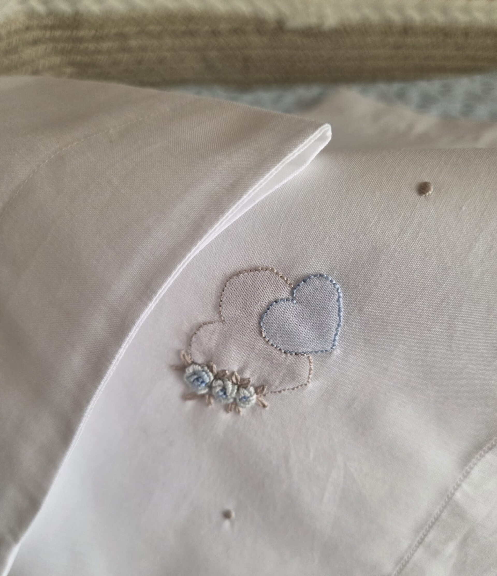 Il lenzuolino è ricamato a mano a punto ombra , punto pieno e punto vapore con filati DMC.