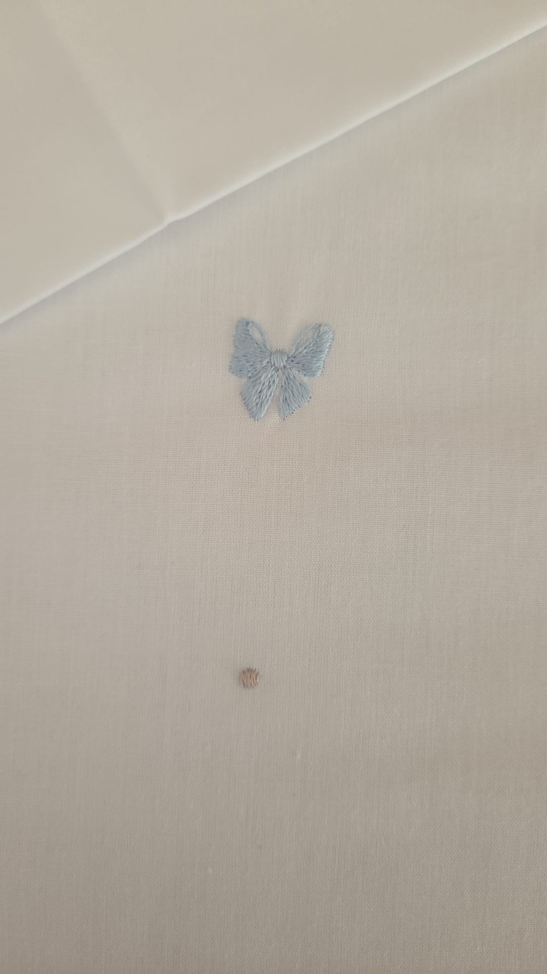 Impreziosito da fiocchetti e pois ricamati a mano a punto pittoresco e punto pieno con filati DMC nelle tonalità del celeste e tortora.