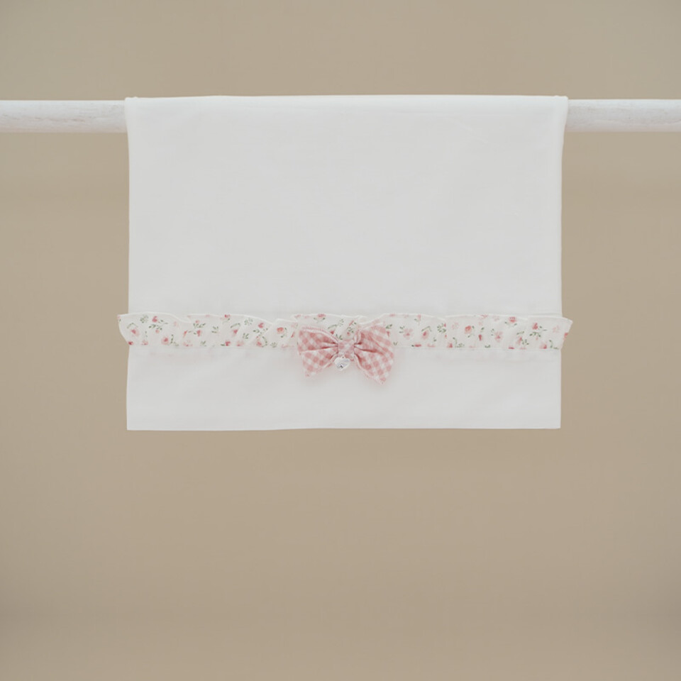 Set lenzuolino 3 pezzi bianco in puro cotone con balza arricciata fantasia floreale e fiocchetto a quadri bianchi e salmone, lenzuolo sotto con elastici e federa.