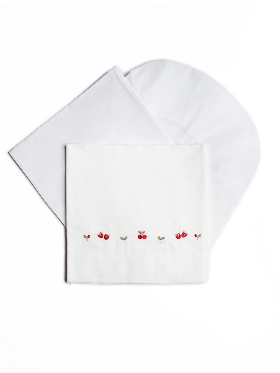 Set lenzuolino 3 pezzi bianco in puro cotone con dettagli ricamati color rosso e verde, lenzuolo sotto con elastici e federa.