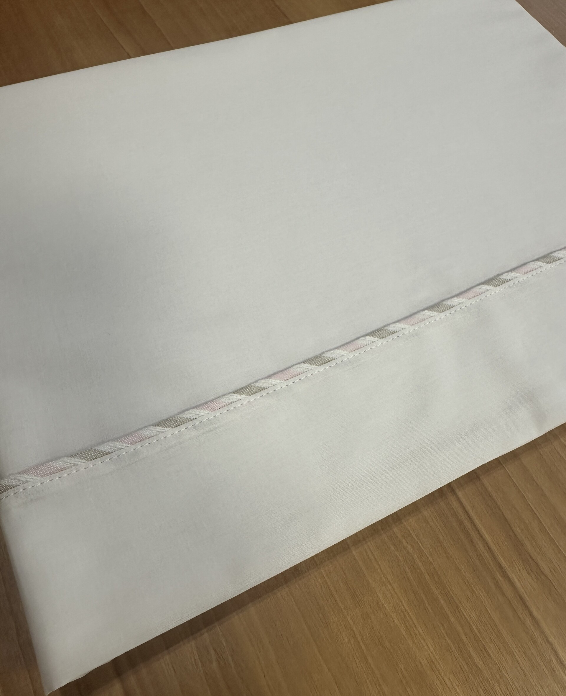 Set lenzuolino 3 pezzi panna in puro cotone con dettagli color rosa e beige, lenzuolo sotto con elastici e federa.
