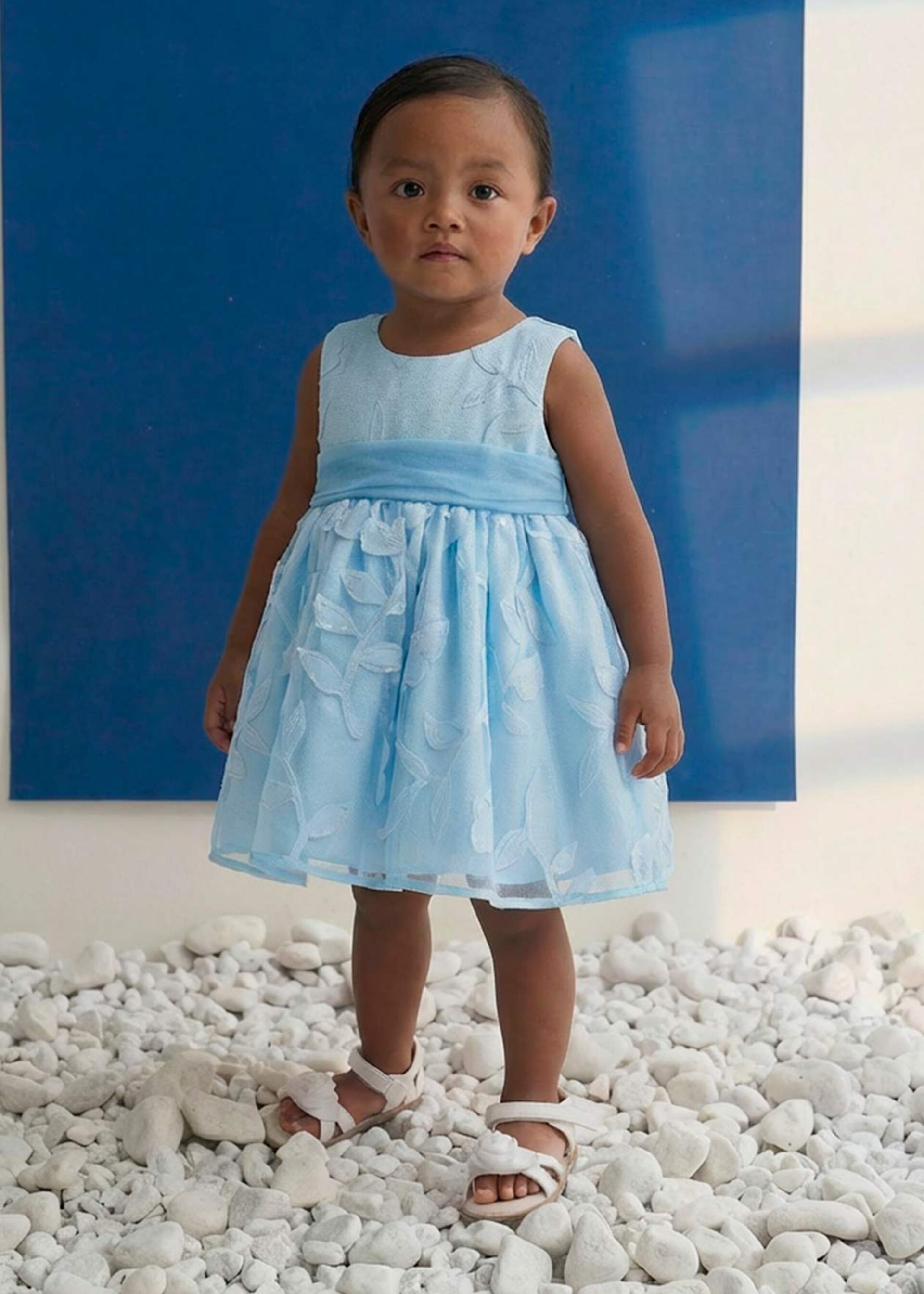 Il tulle leggero e vaporoso dona volume, le applicazioni floreali impreziosiscono il vestito con un tocco romantico, arricchite da piccole paillettes che catturano delicatamente la luce.
