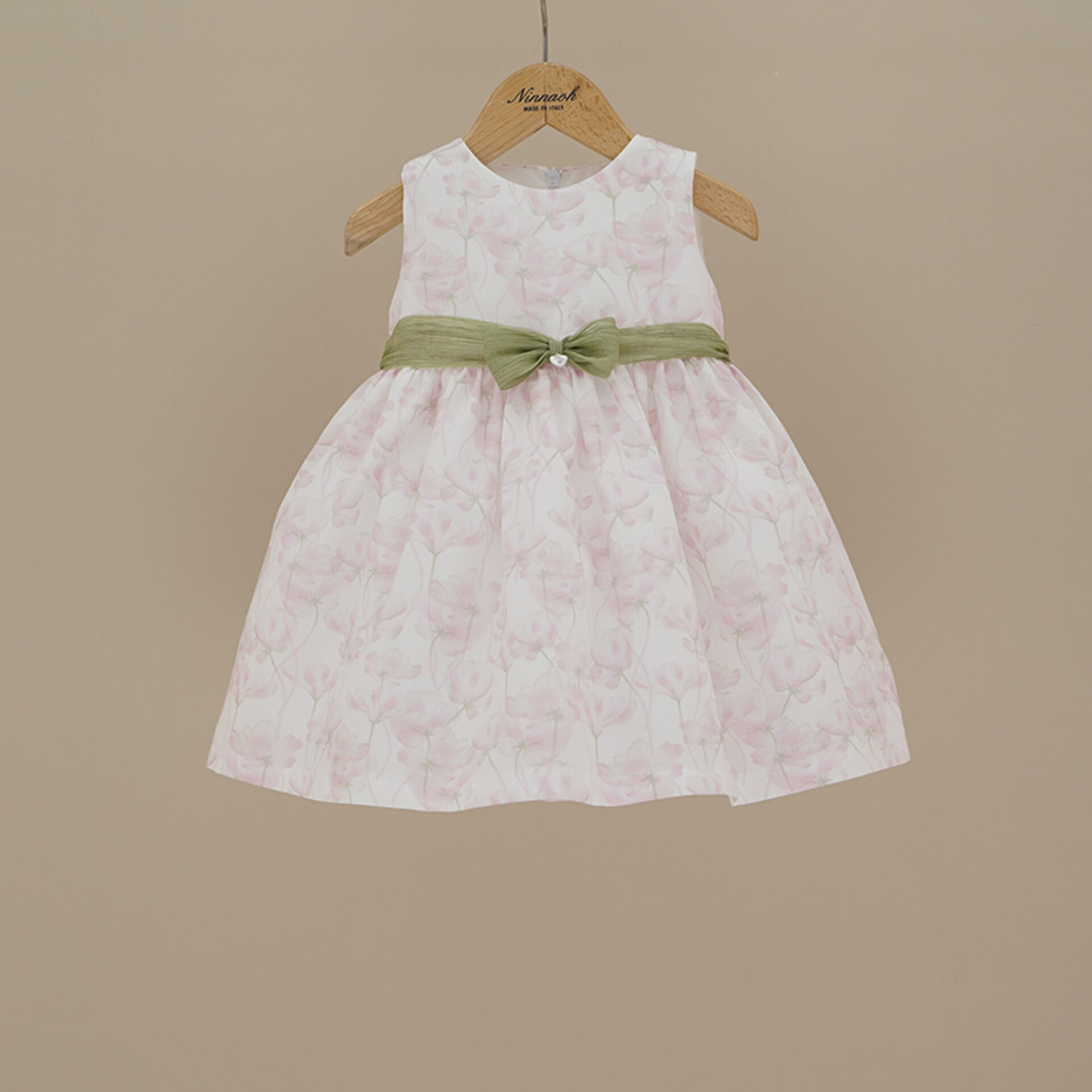 Delicato abito da cerimonia realizzato in puro cotone con fantasia floreale con cinturino verde.