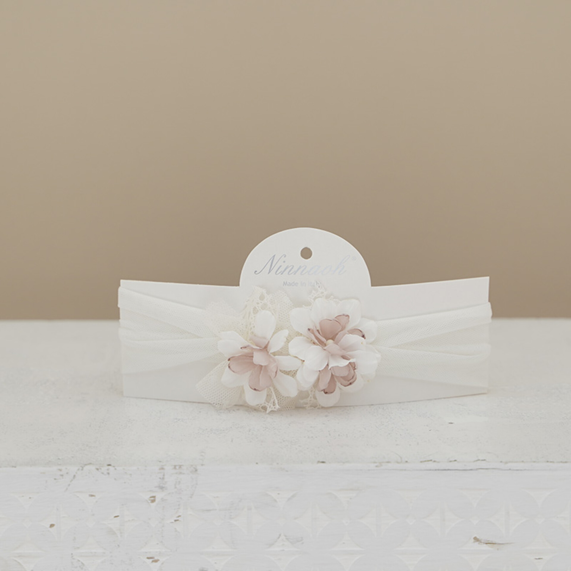 Fascetta elastica in tulle con fiori in rilievo.