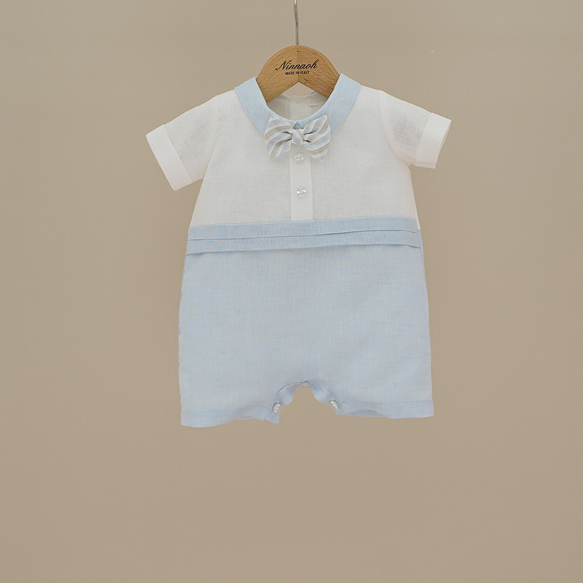 Elegante pagliaccetto realizzato in lino e cotone con colletto e papillon.
