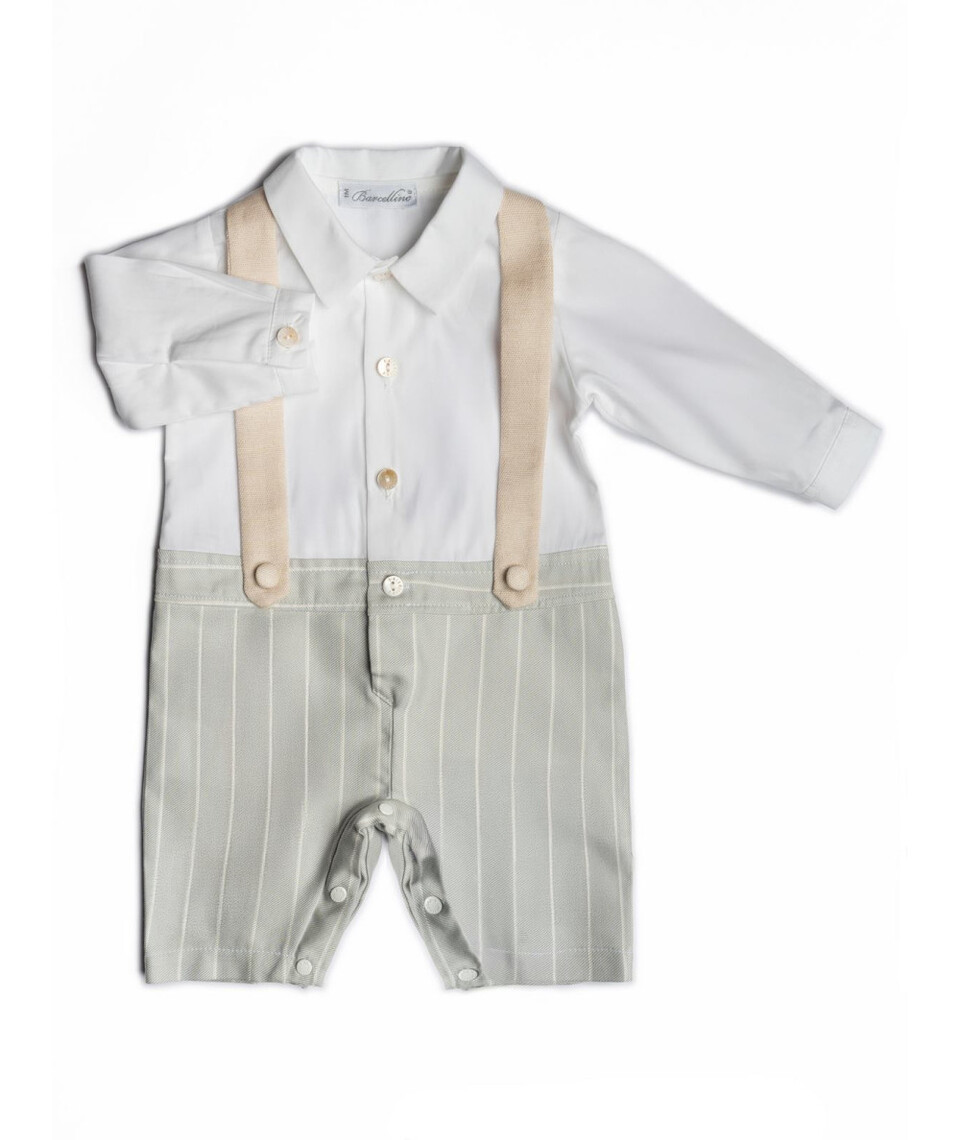Tutina in puro cotone bianca con bretelle e tessuto a righe bianche e cielo nella parte inferiore.