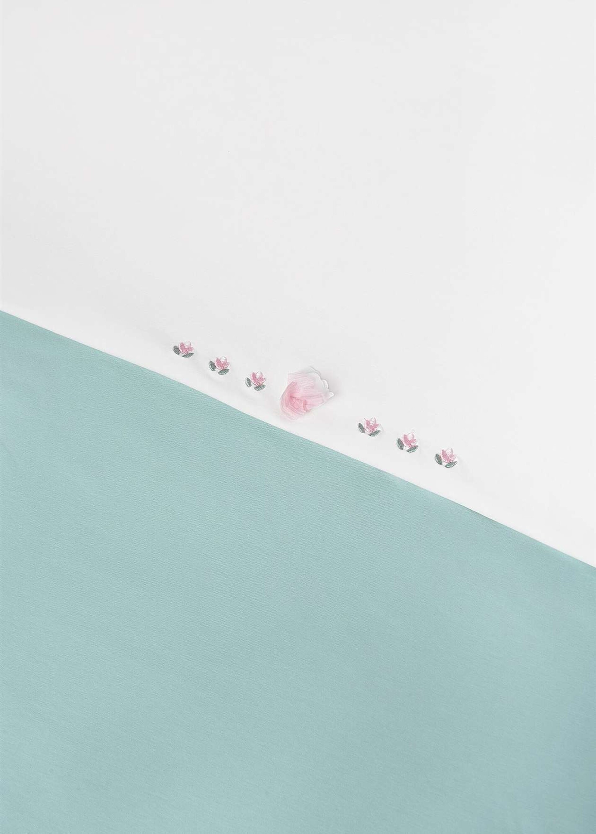 Copertina per carrozzina in jersey di cotone color verde acqua e panna con fiorellini ricamati e fodera integrata.