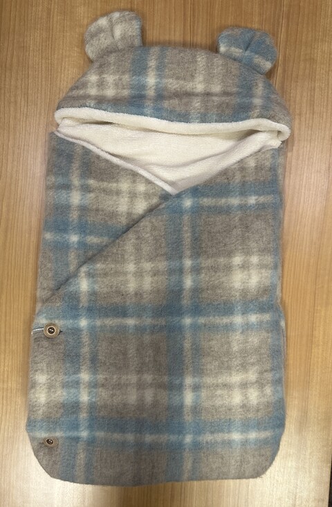 Sacco nanna a quadri beige e cielo con morbido pile interno, cappuccio e simpatiche orecchiette, apertura con asole e bottoni.
