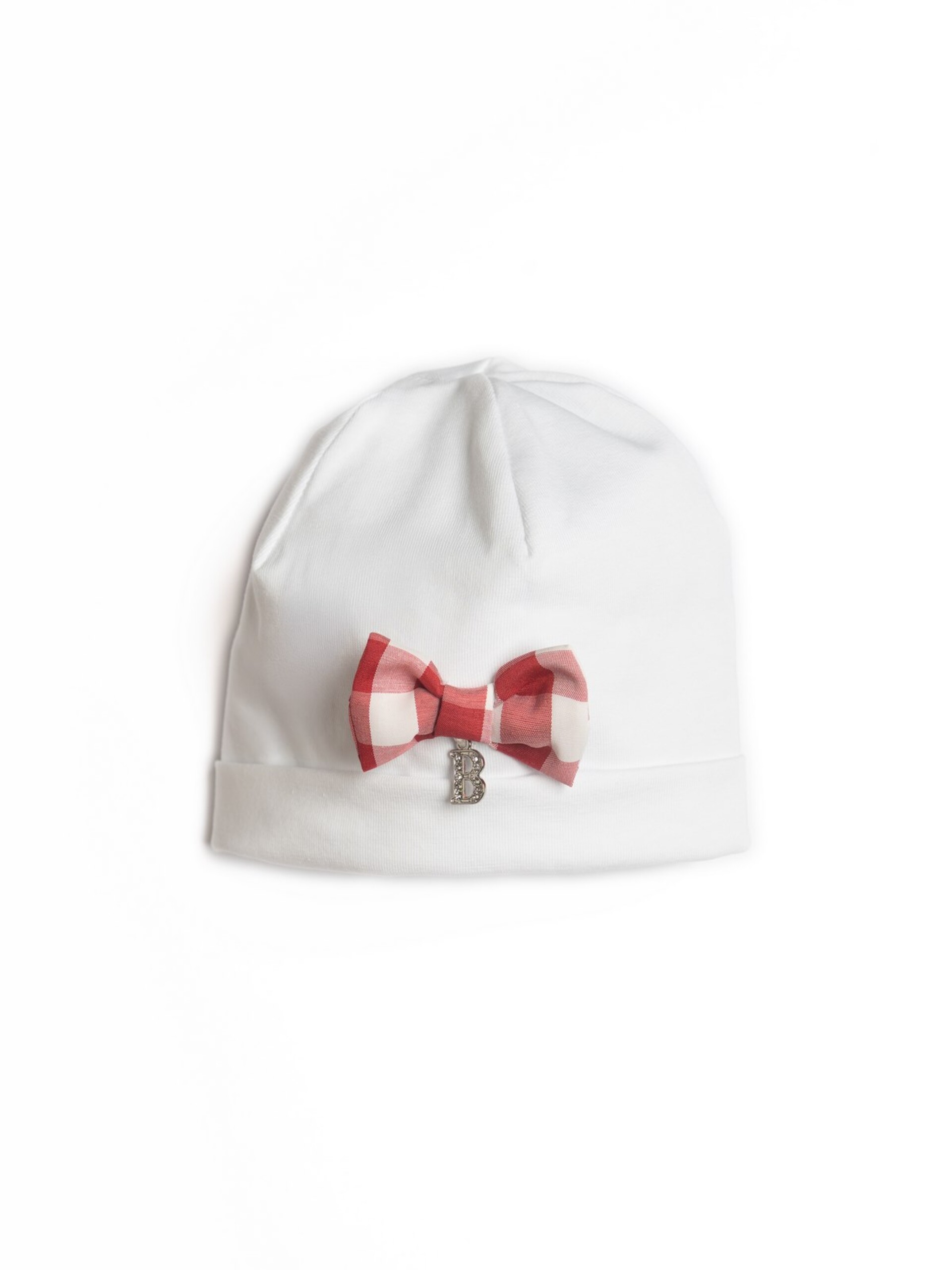 Cappellino in jersey di cotone color bianco con fiocchetto a quadri bianchi e rossi.