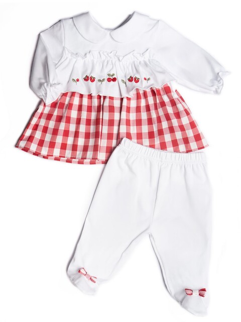 Maglia bianca con colletto, dettagli ricamati color rosso e verde e tessuto a quadri bianchi e rossi nella parte inferiore; apertura posteriore con automatici a pressione.