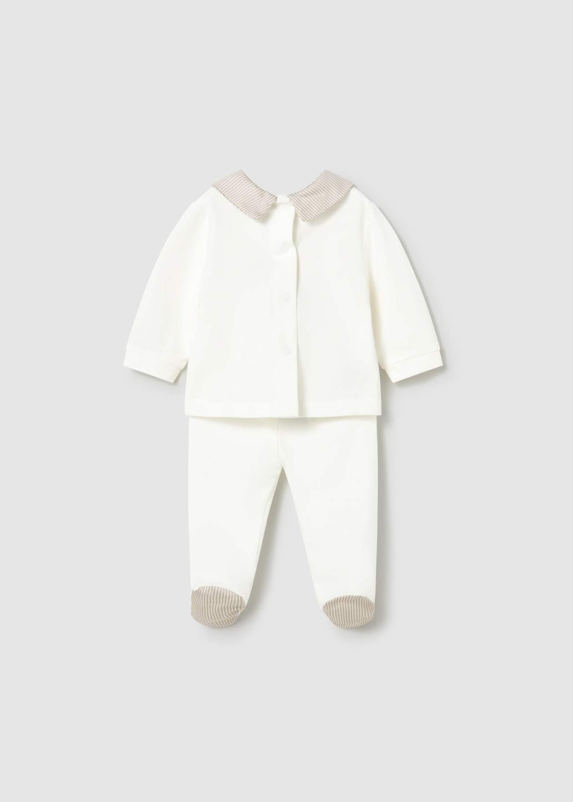 Maglia manica lunga panna con colletto a righe, apertura posteriore con automatici a pressione.