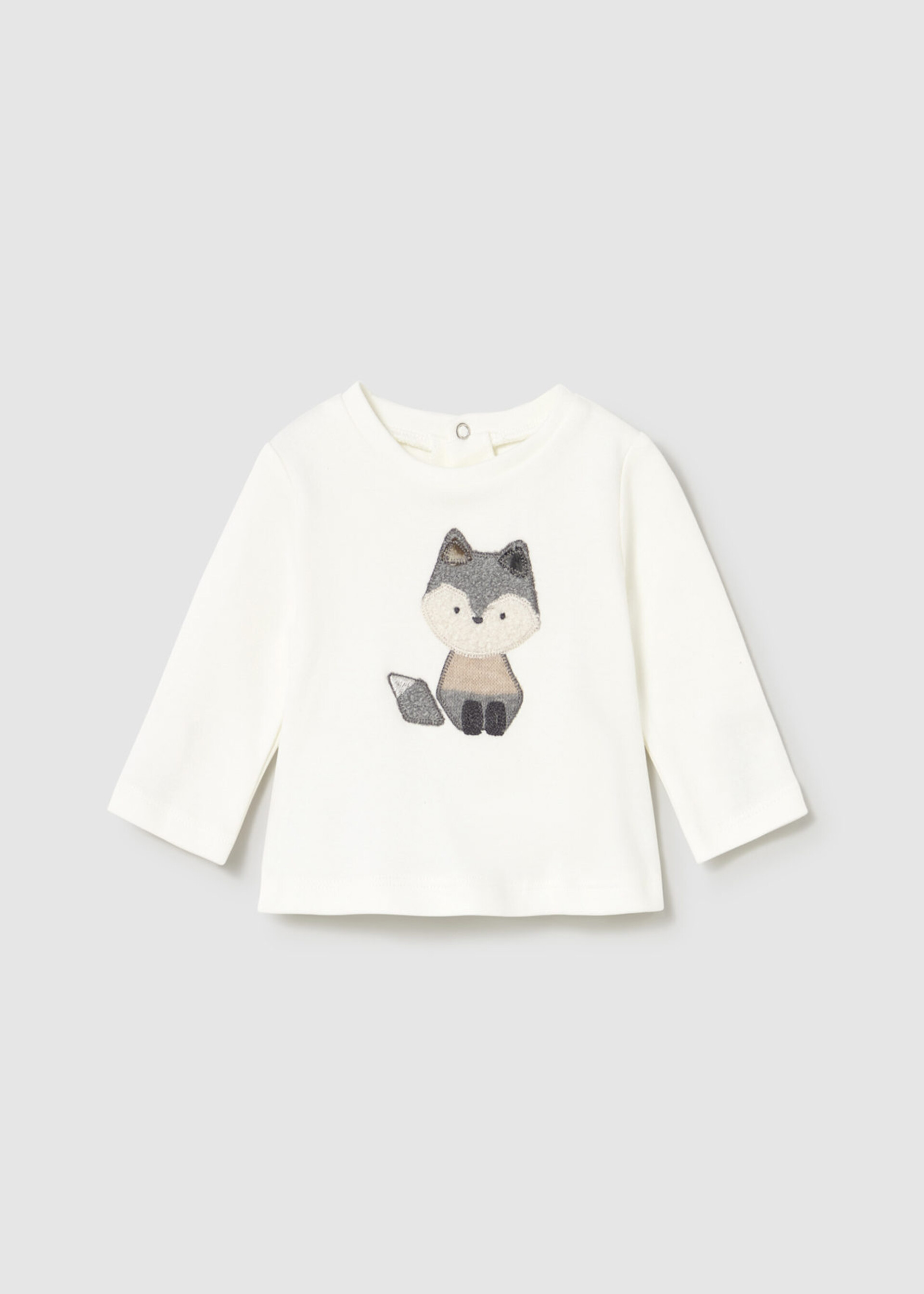 Maglietta in caldo cotone bianca con volpina applicata, apertura posteriore con automatici a pressione.