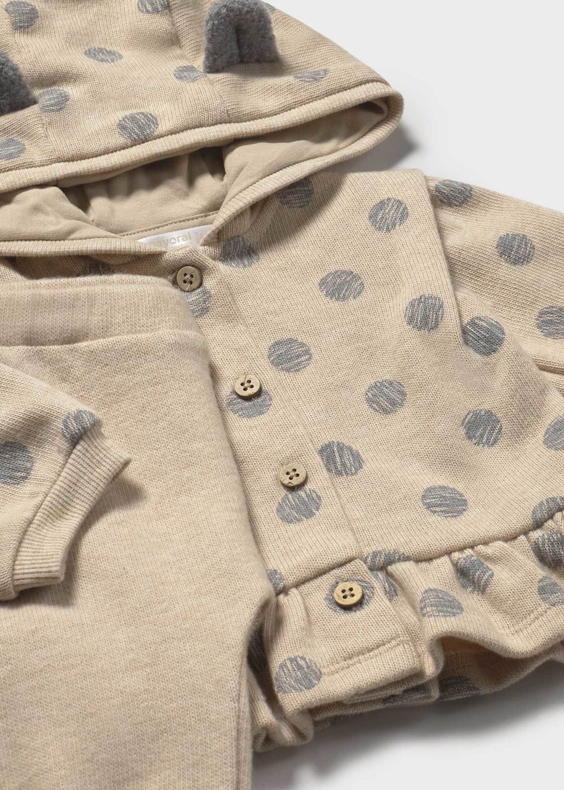 Felpa con cappuccio beige e pois grigi, apertura anteriore con asole e bottoni.