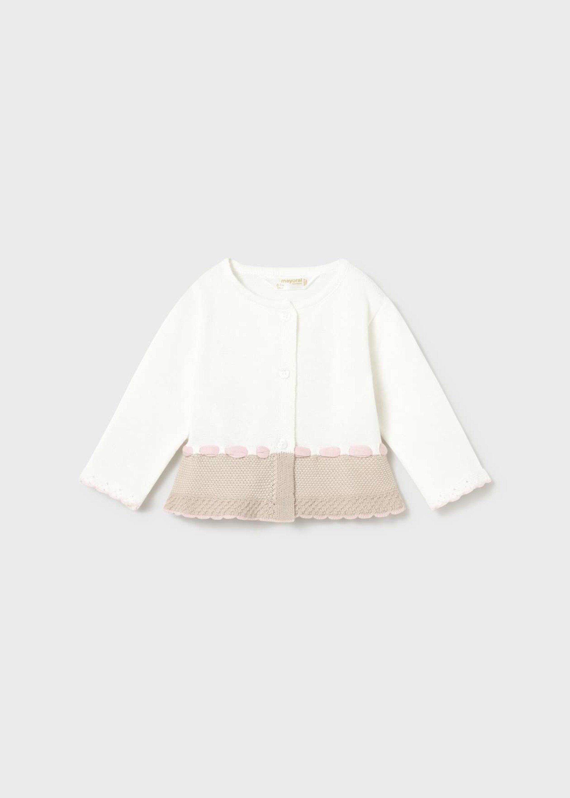 Giacchino panna e tortora con dettagli rosa, apertura anteriore con asole e bottoni.