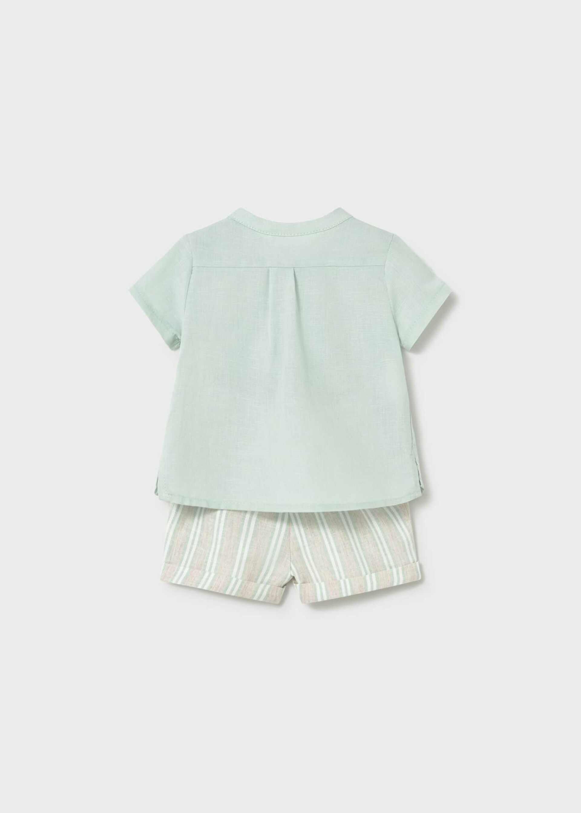 Pantaloncino a righe beige e verde con elastico in vita e asola e bottone.