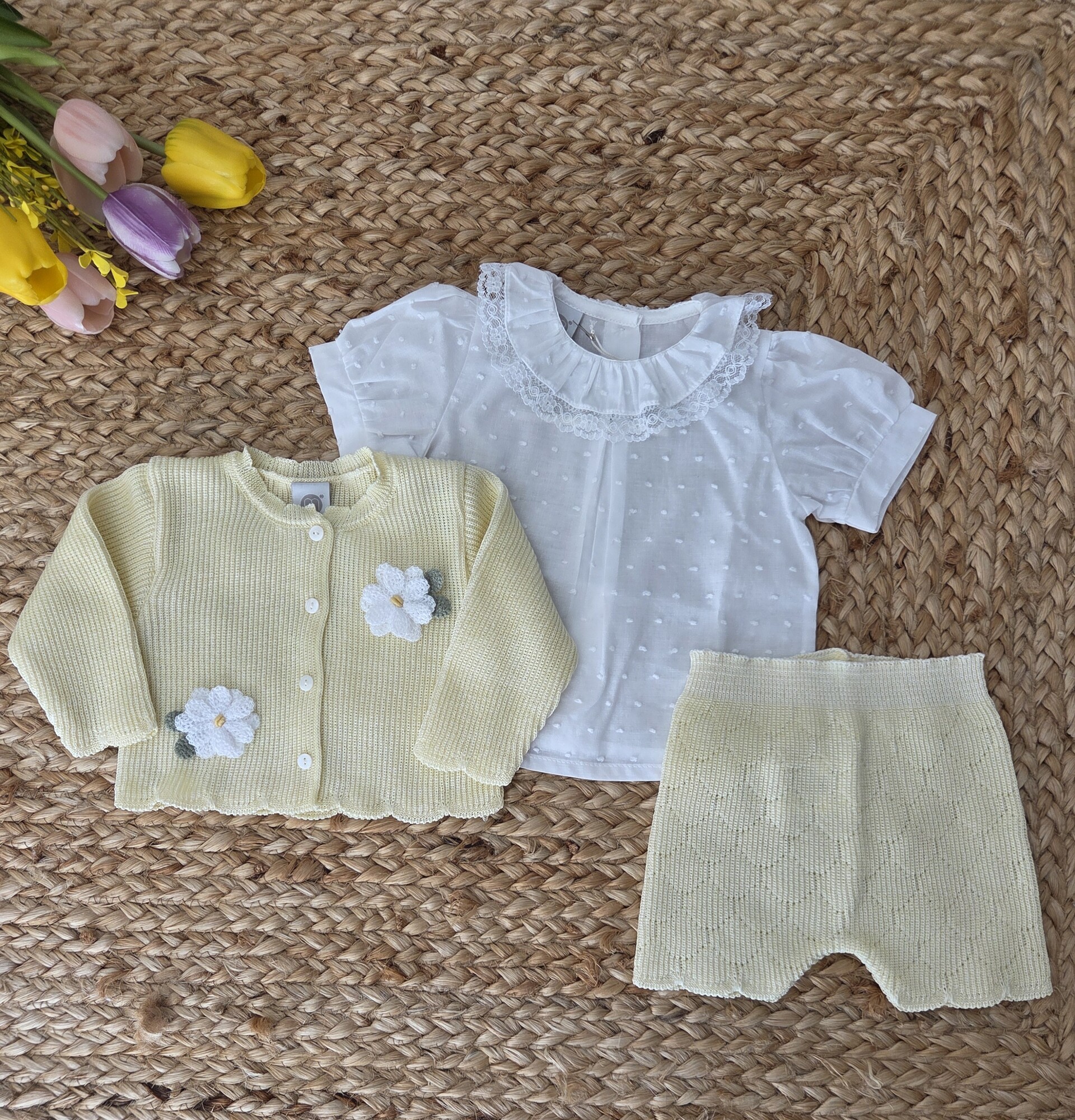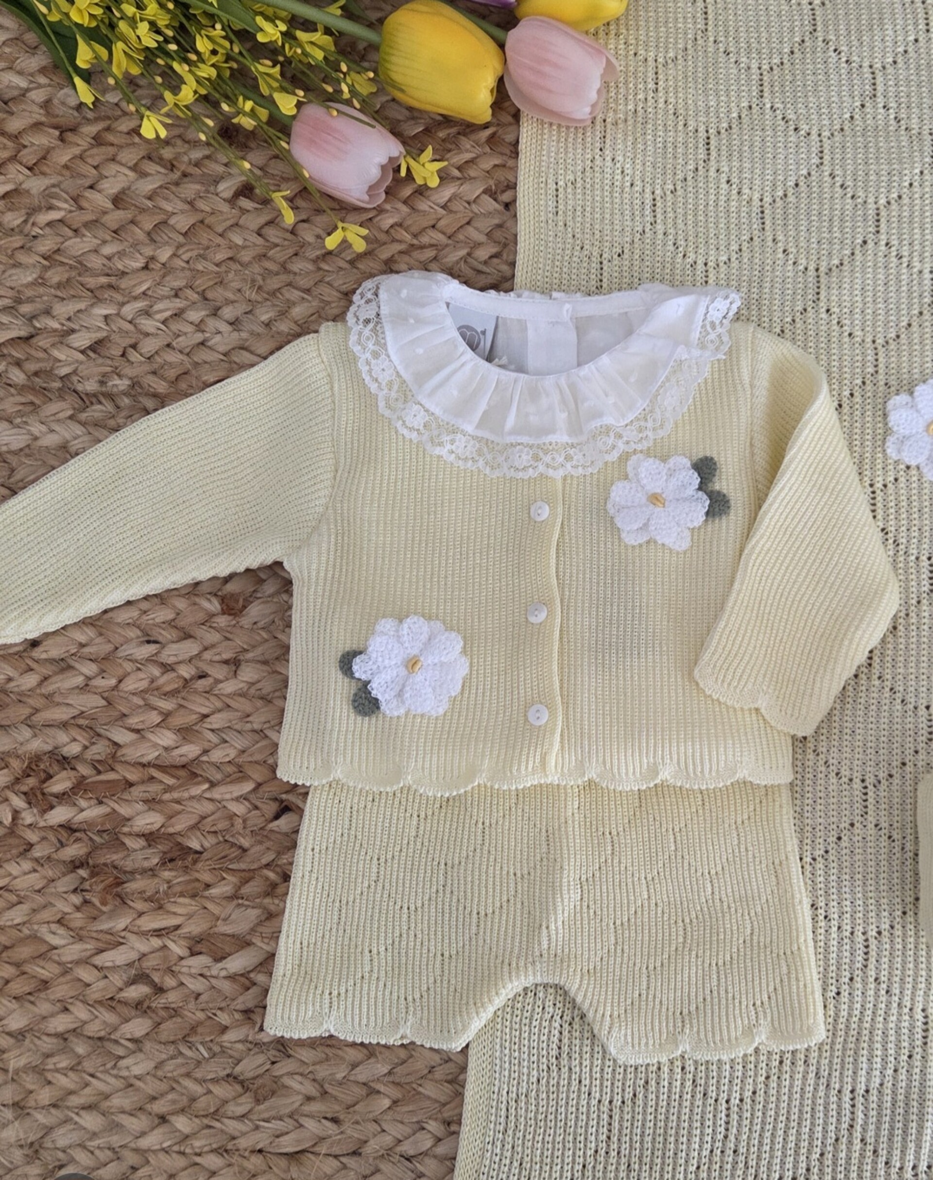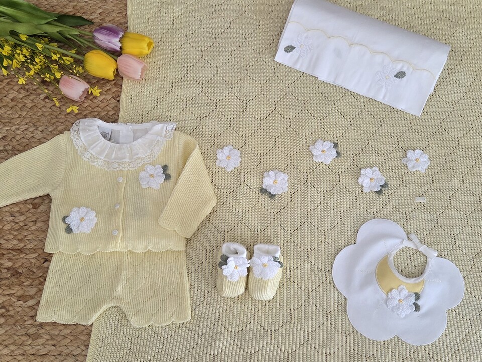 Completo nascita 7 pezzi in filo di puro cotone giallo tenue con applicazioni a rilievo.