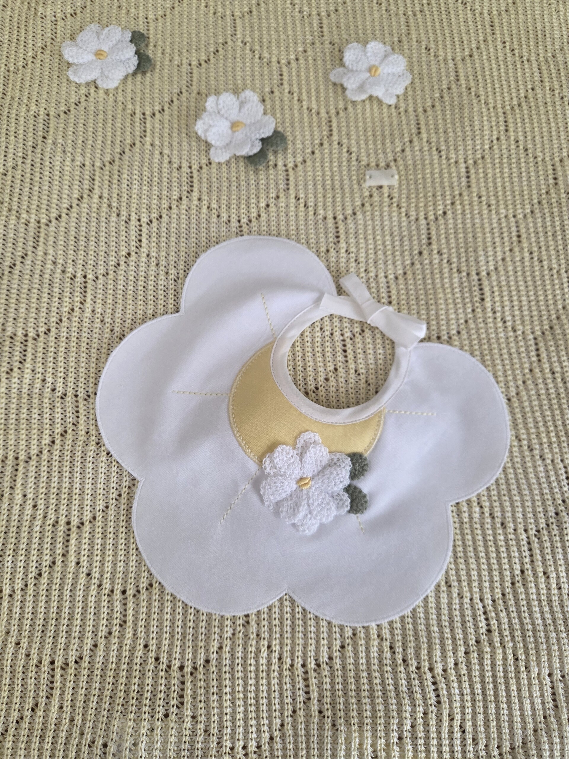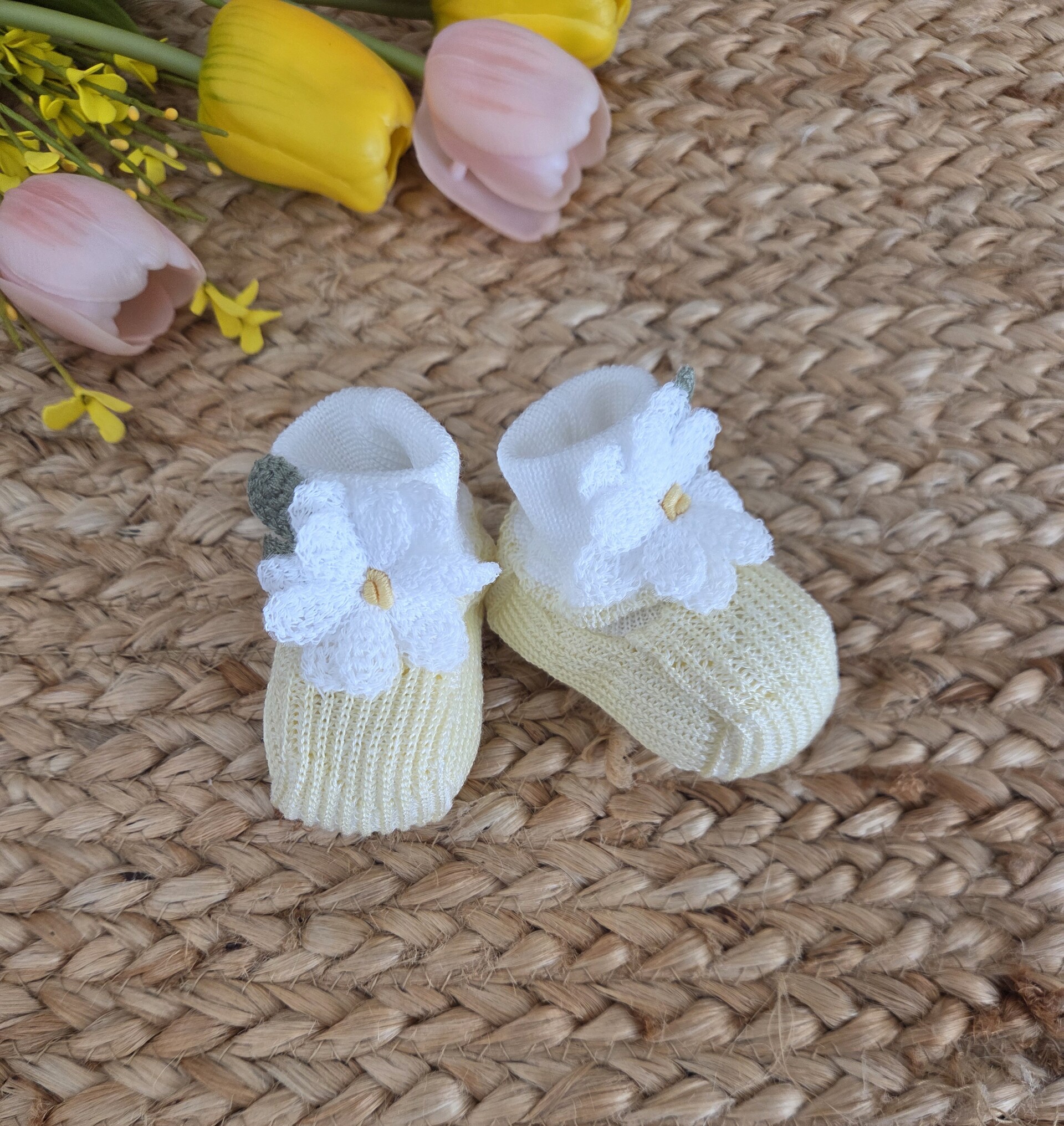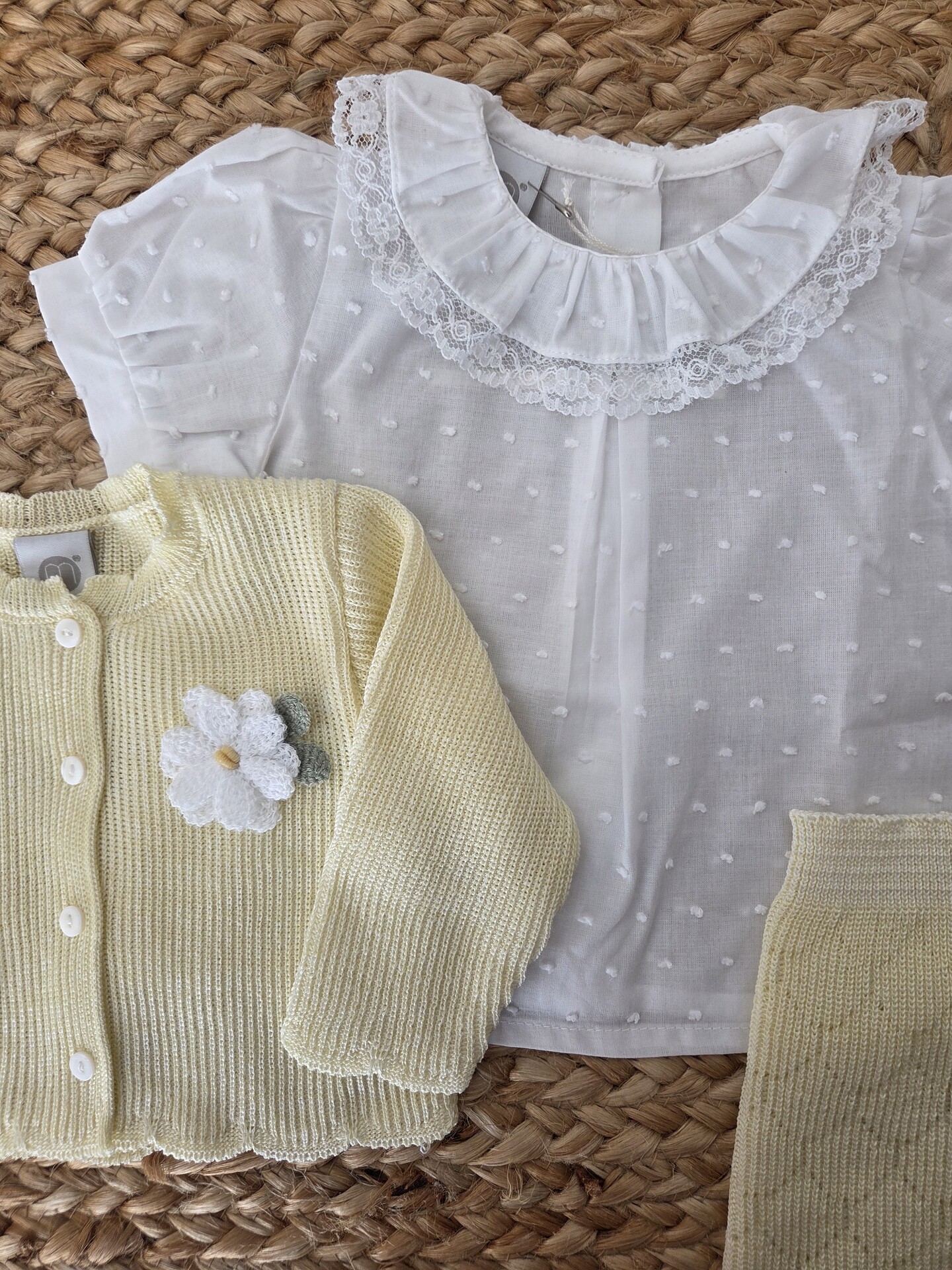 Completo nascita 7 pezzi in filo di puro cotone giallo tenue con applicazioni a rilievo.