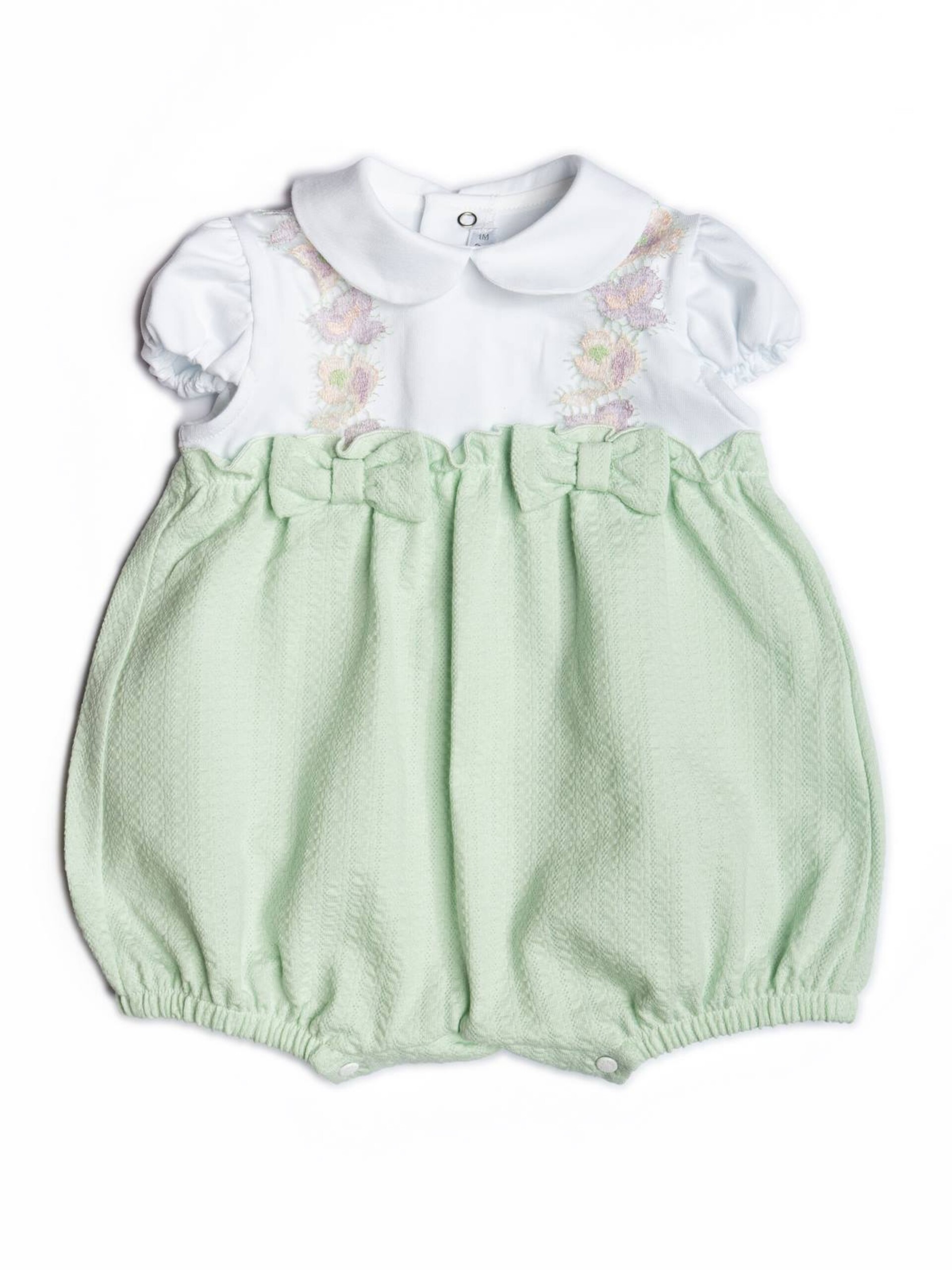Pagliaccetto con colletto, fiori applicati e fiocchetti.