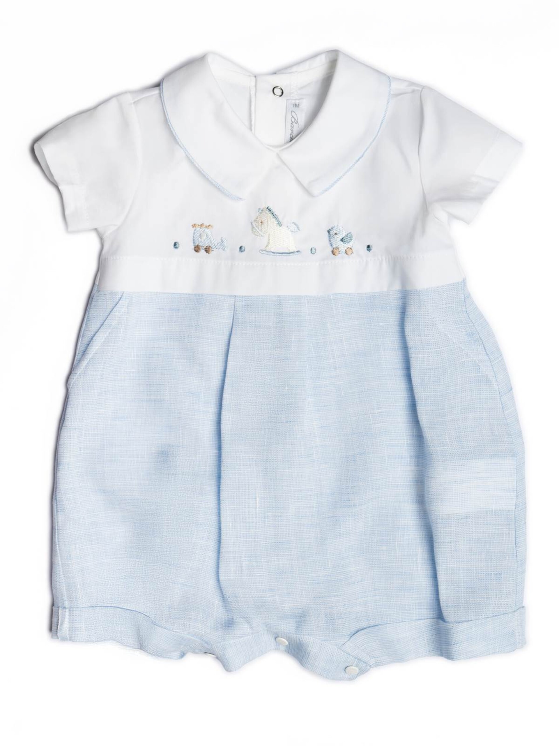 Raffinato pagliaccetto realizzato in lino e cotone con colletto e dettagli ricamati.