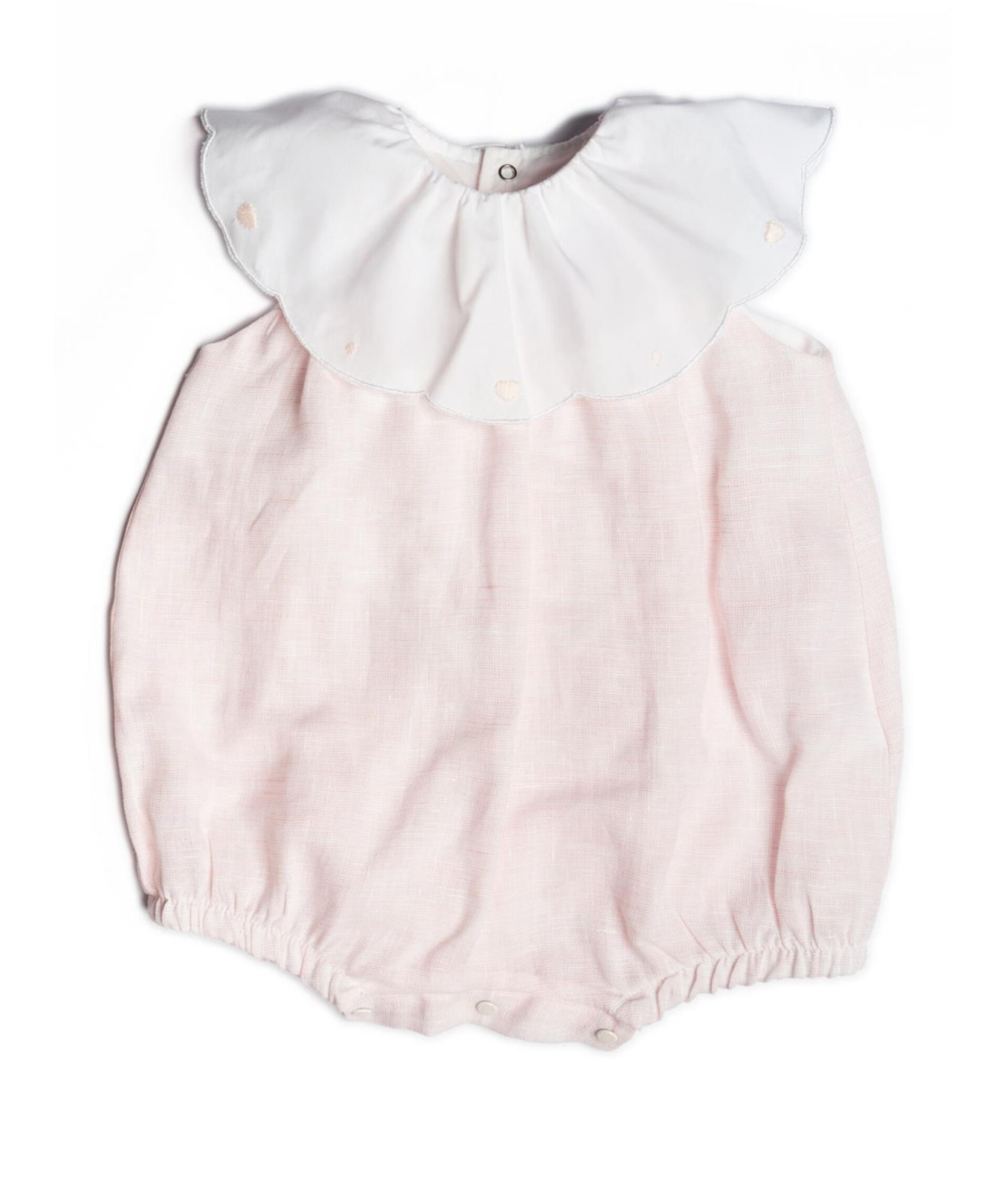 Elegante pagliaccetto in puro lino rosa con colletto bianco e ricami rosa.