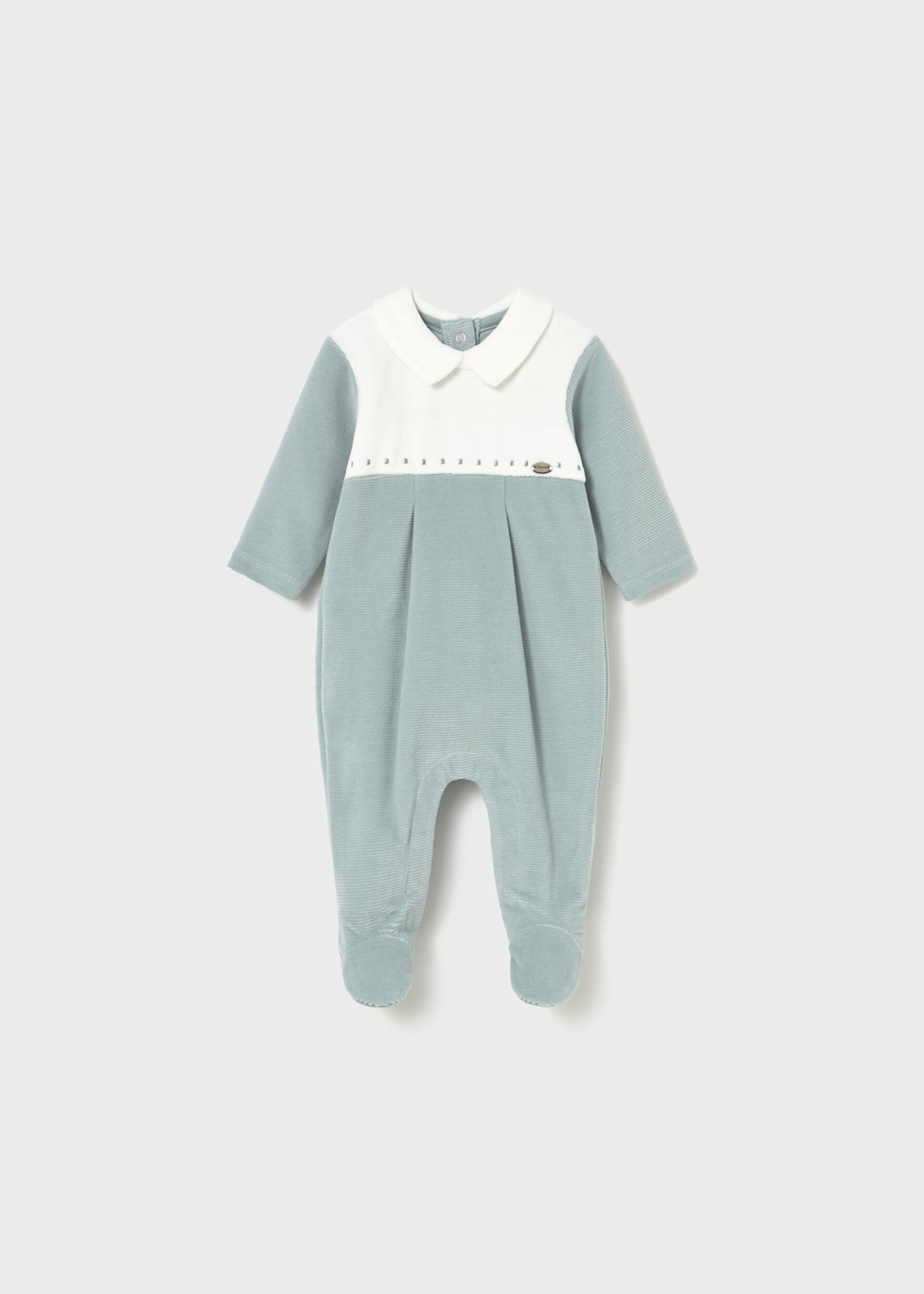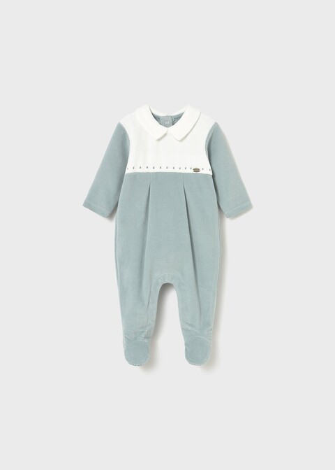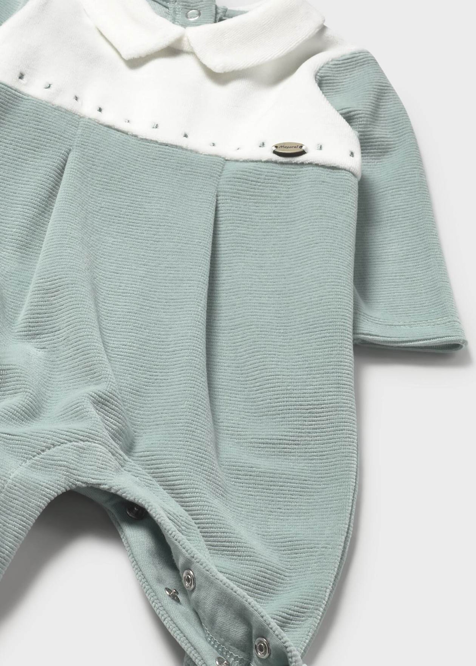 Tutina in ciniglia con colletto e dettagli ricamati.