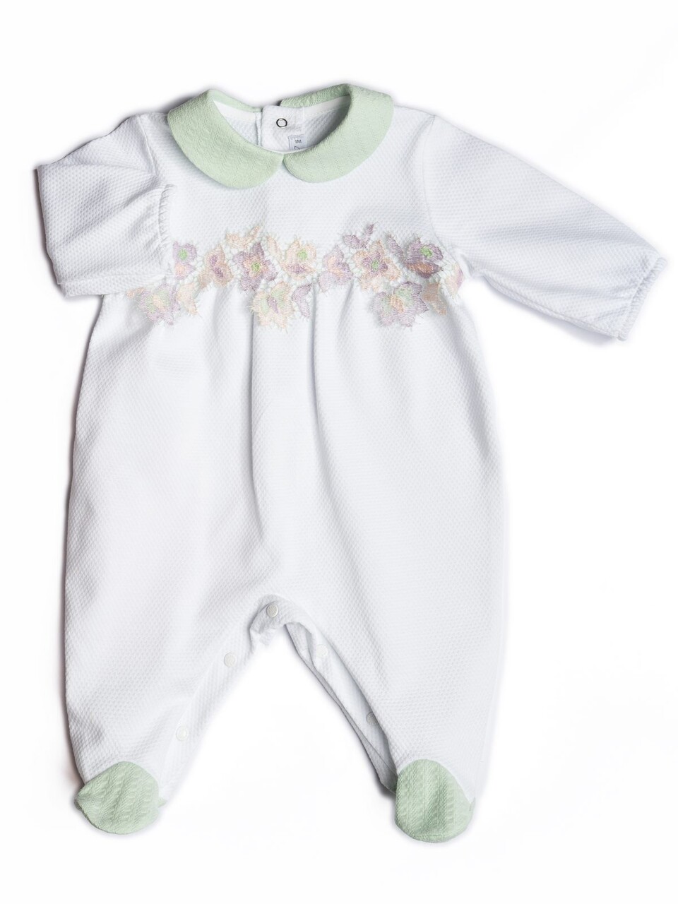 Tutina in cotone con colletto e fiori applicati nella parte superiore.