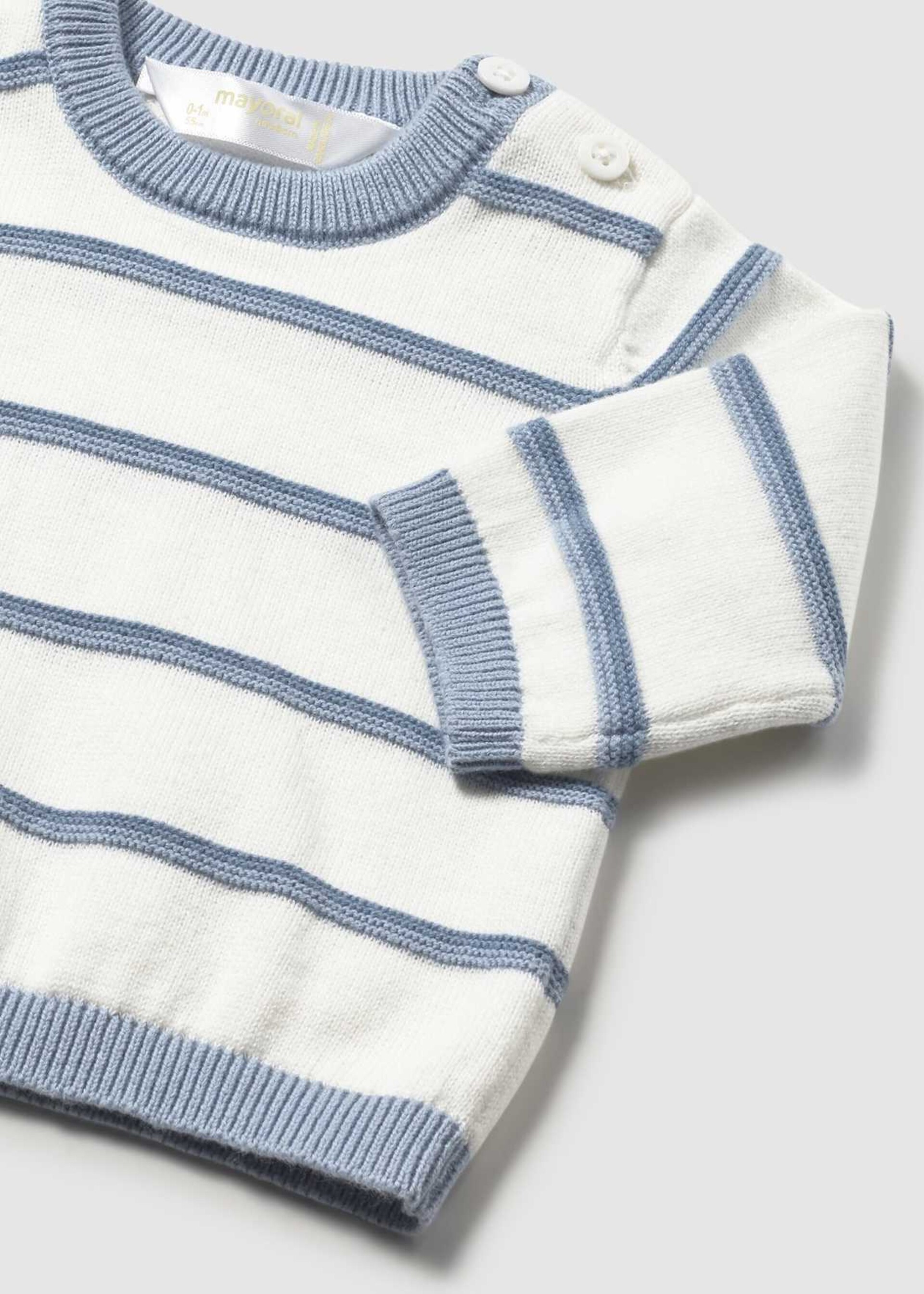 Morbido maglione per neonato in puro cotone a righe bianche e azzurre.