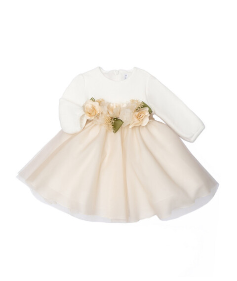 Elegante abito da cerimonia con parte superiore in morbida maglia, gonna in tulle, fascetta abbinata e fodera integrata.