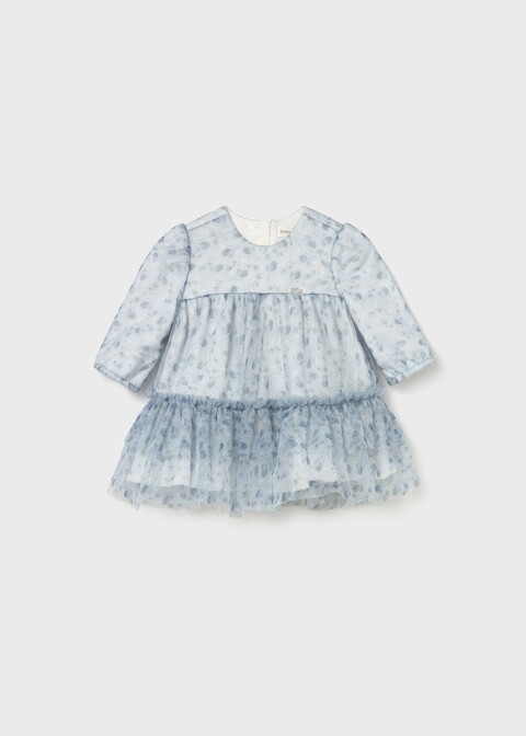 Elegante abito manica lunga rivestito interamente in tulle stampato con fodera integrata.